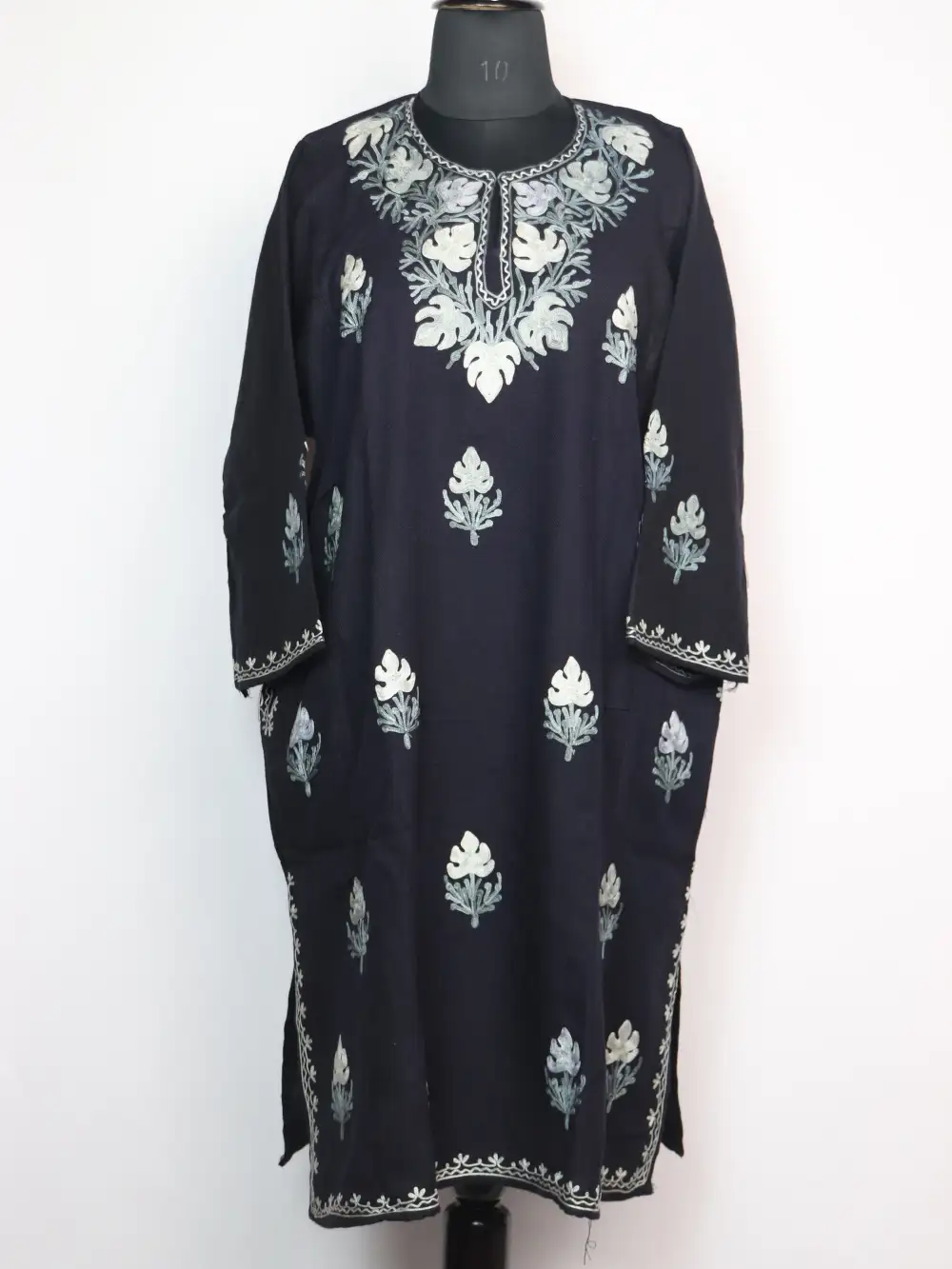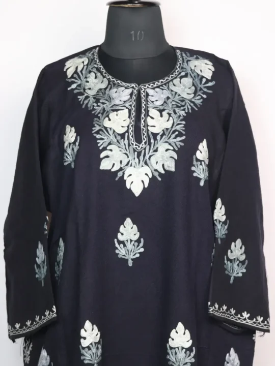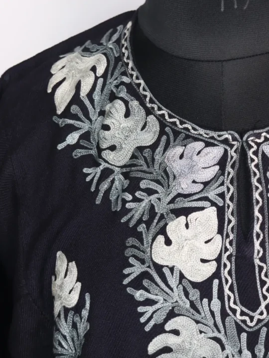 This cashmilon wool pheran has a comfortable and warm feel, making it easy to wear for long hours. The chinari aari embroidery with bootis adds a clean, graceful look that blends well with the soft fabric.