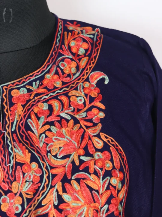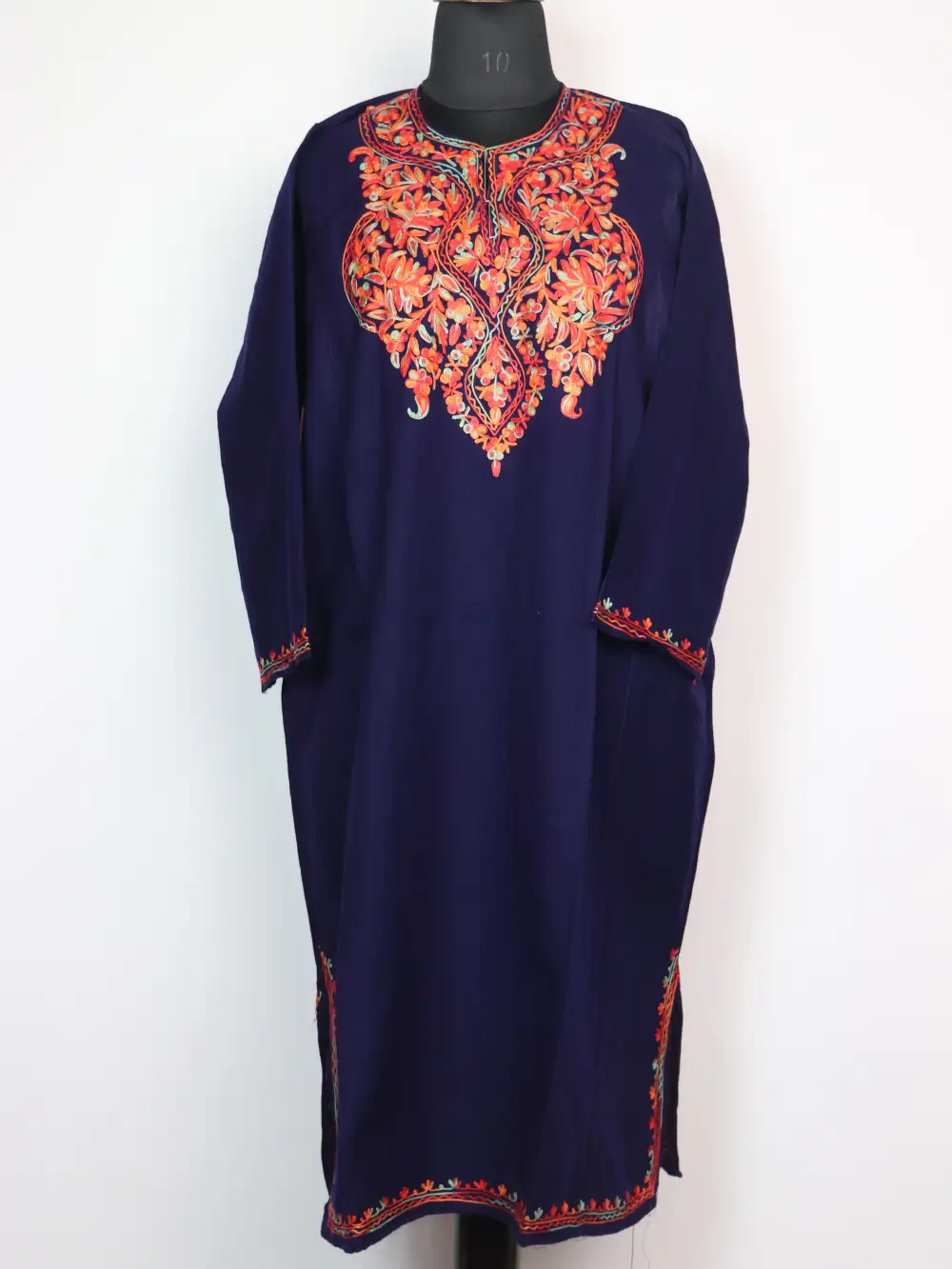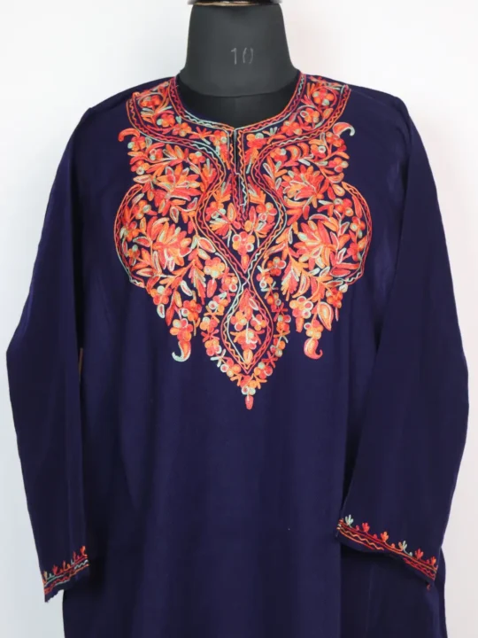 This cashmilon wool feran has Aari floral kadhai around the neckline, keeping the look beauty of Kashmiri culture.