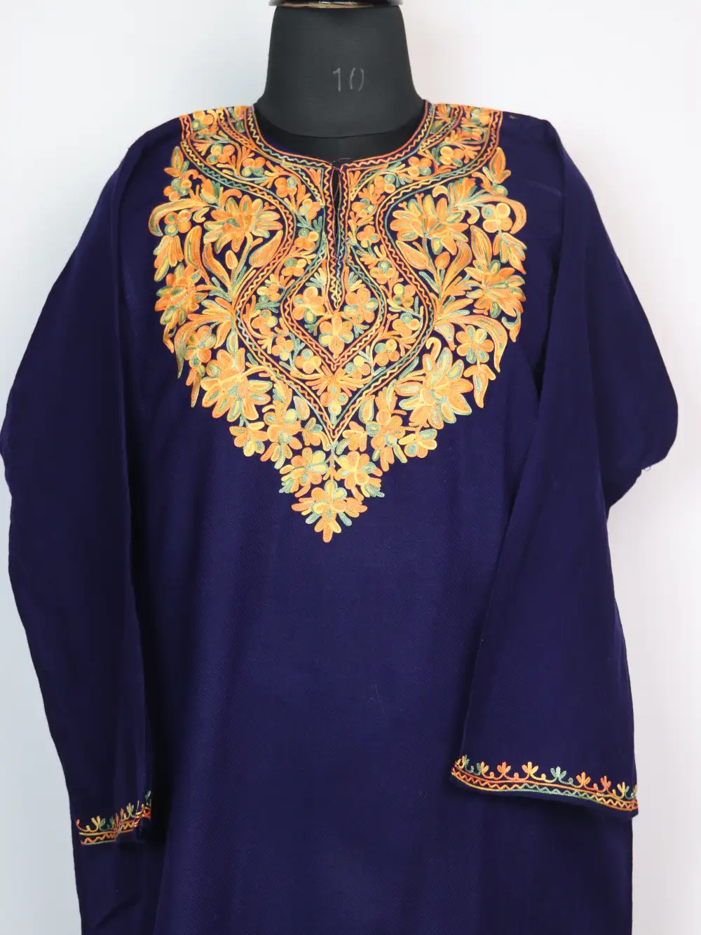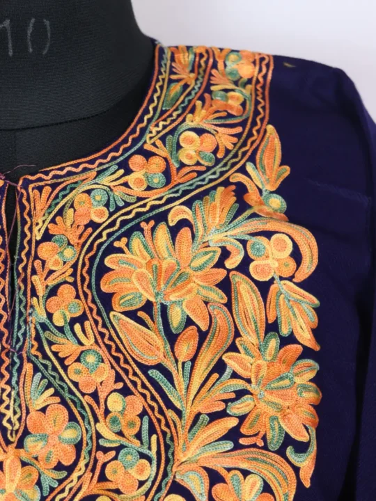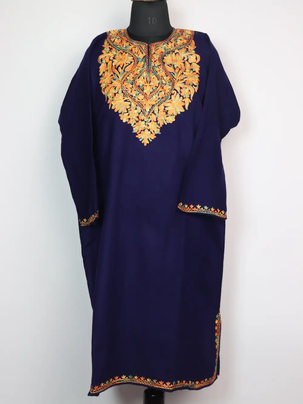 This Cashmilon wool pheran comes with Aari flowers kadhai motifs placed neatly around the neckline.