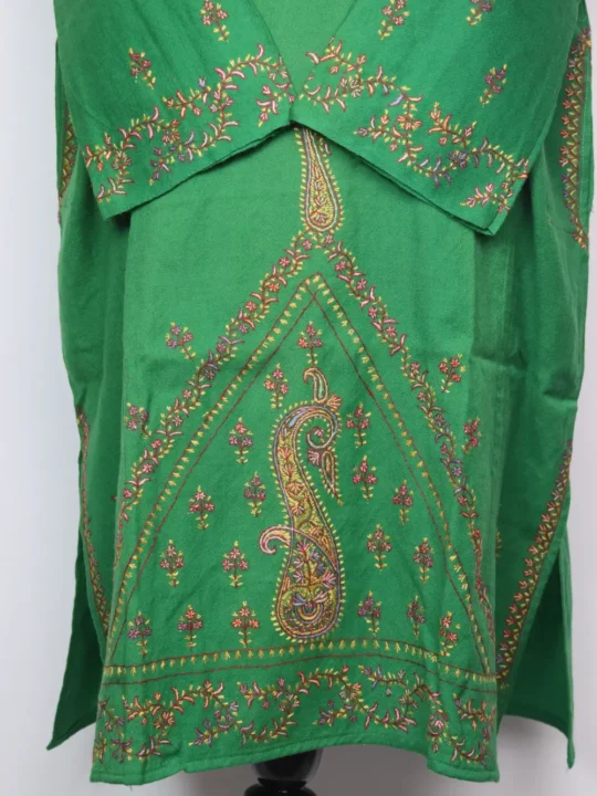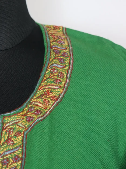 A green raffal wool firan with clean hand sozni work on the neckline and a matching embroidered border at the bottom that give this pheran a elegant look.