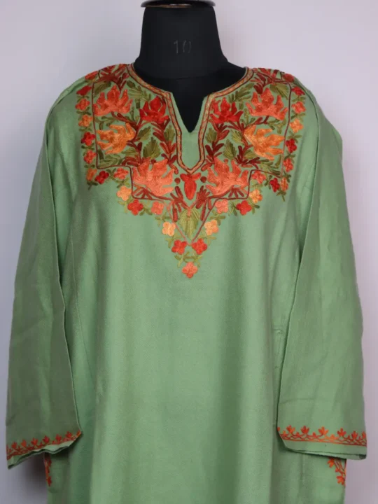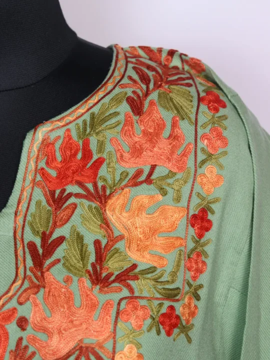 Made from smooth cashmilon wool, this pheran features detailed chinari aari kadhai around the neckline, adding a gentle touch of tradition to its clean and comfortable design.