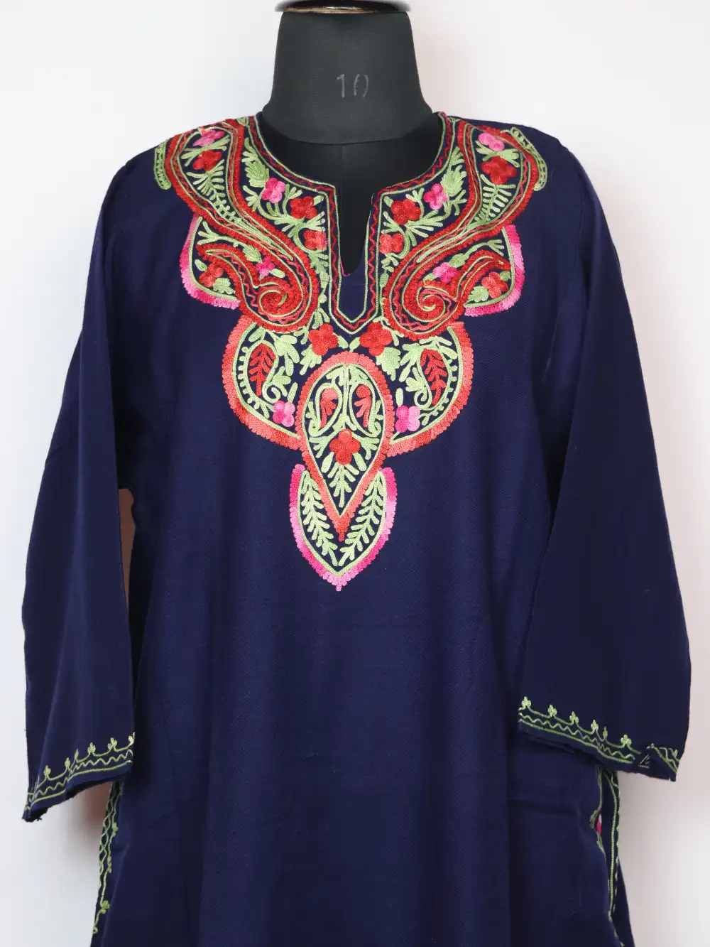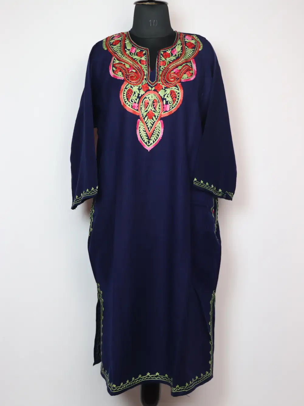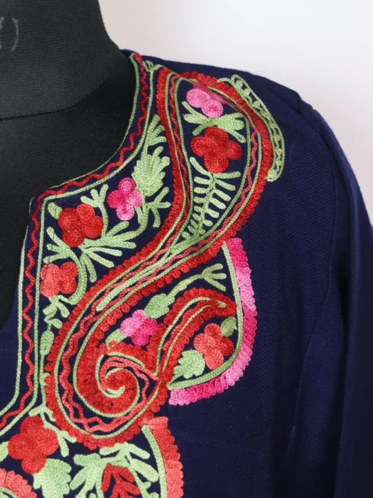 The neckline has neat badam aari kadhai motifs that blends well with the cashmilon wool of this Kashmiri feran.