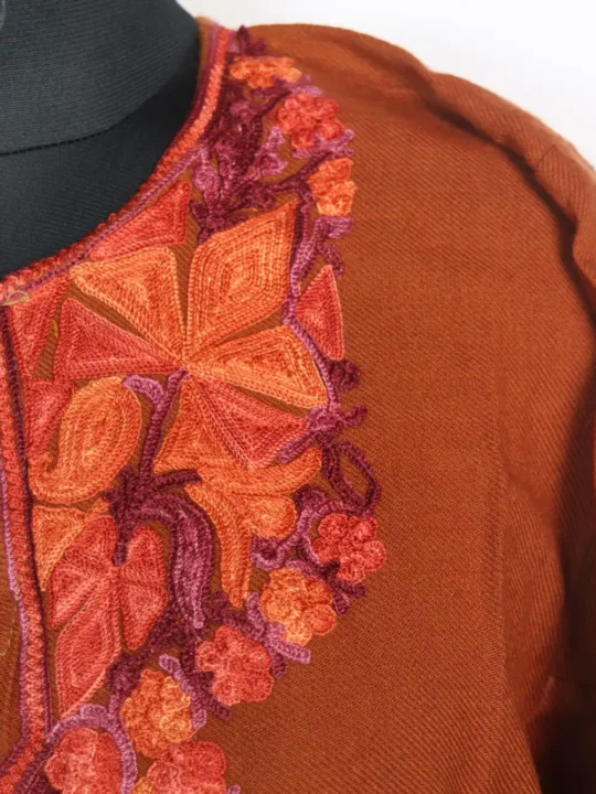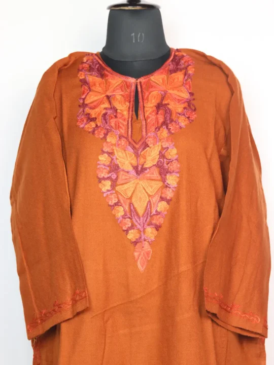 This cashmilon wool feran has chinari aari kadhai around the neckline that gives it a classic and traditional look.