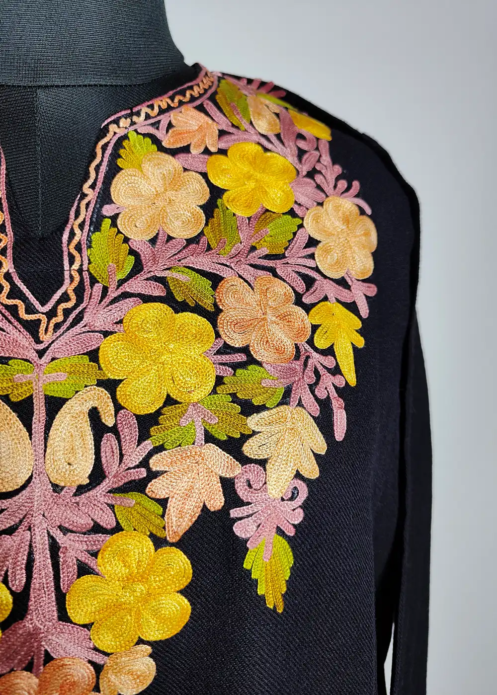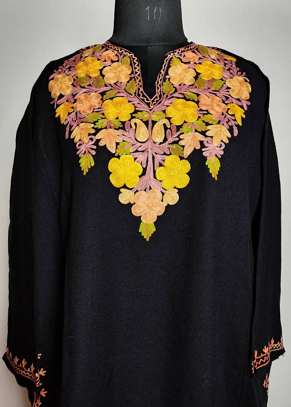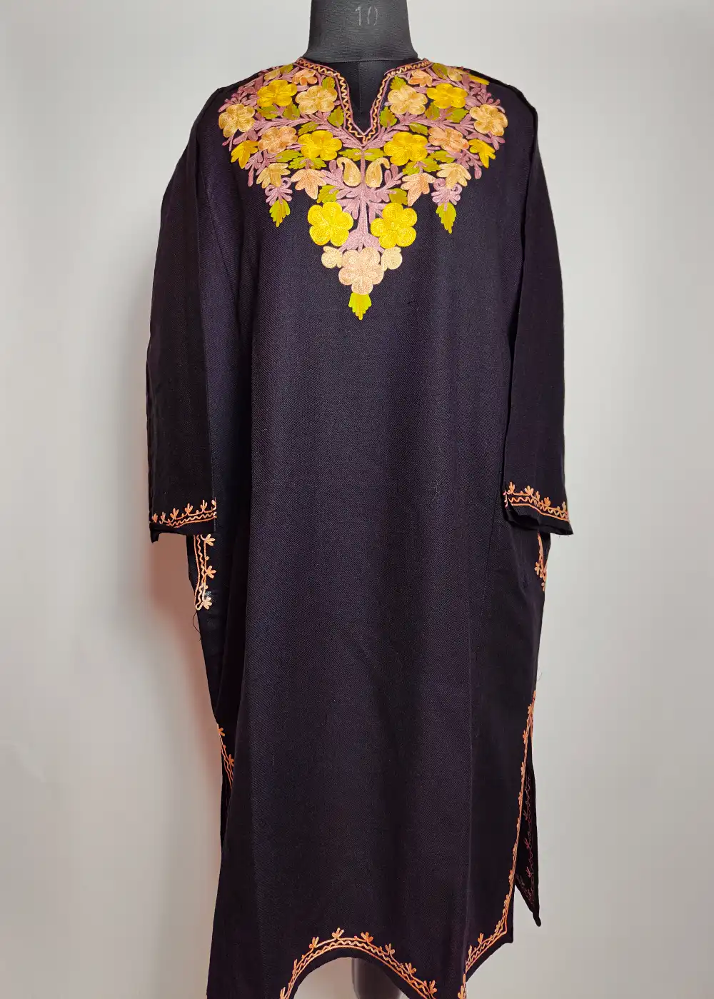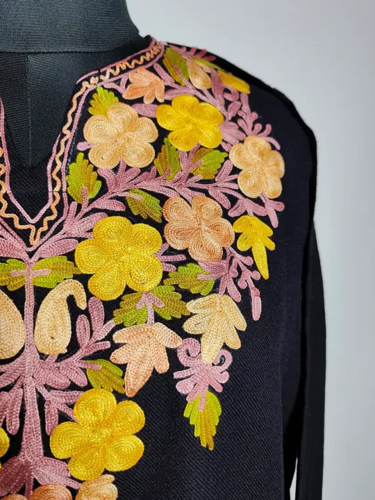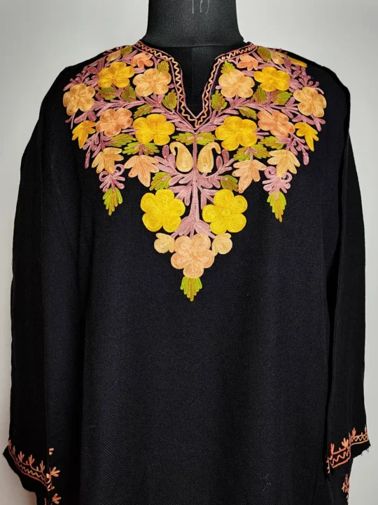 This cashmilon wool feran has elegant floral Aari embroidery around the neckline that gives it a graceful traditional look. The fabric feels warm and comfortable for daily winter wear. It comes in classic Black color.