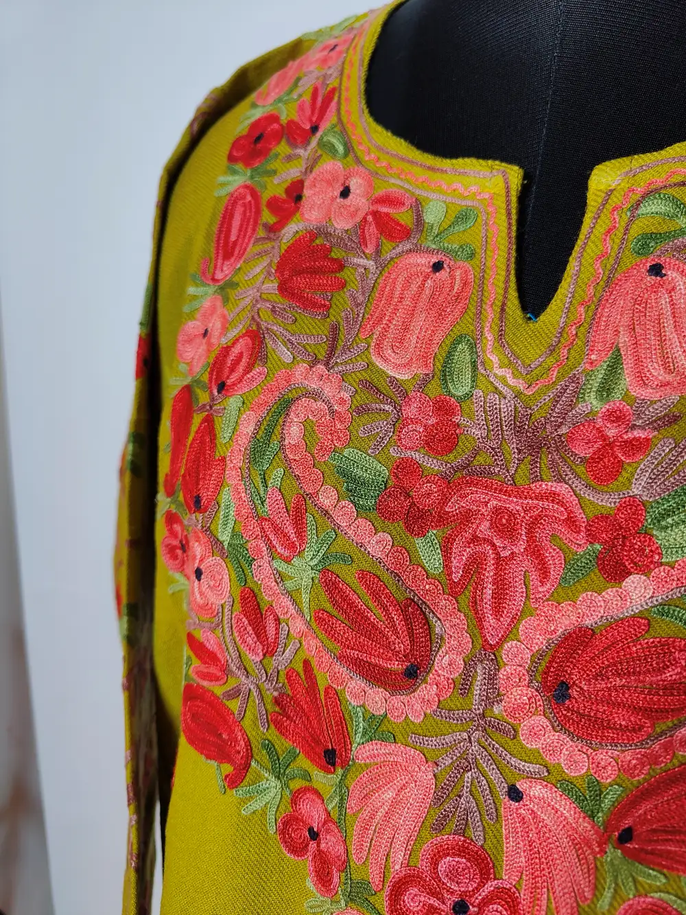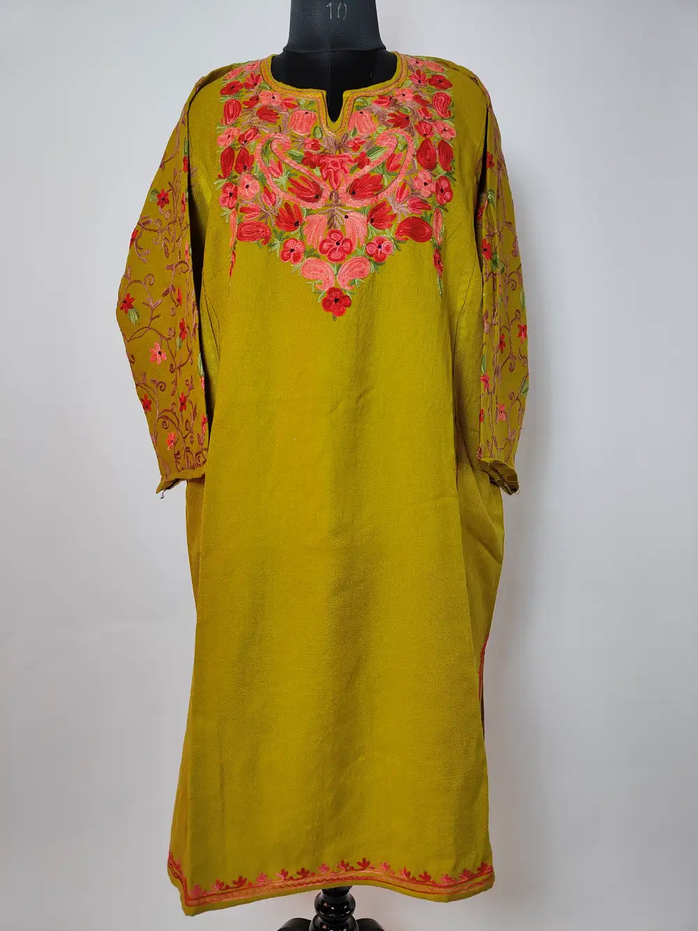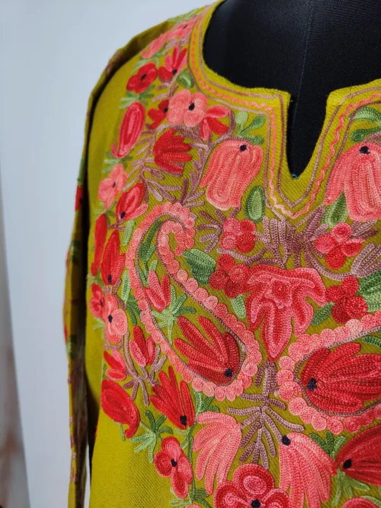 This pheran is made from comfortable cashmilon wool and embroidered delicately with red, pink, and green chinari, badam and floral motifs at the neckline and full of the sleeves. The Aari work brings a refined touch without overwhelming the garment’s simplicity. It is warm yet light, it is perfect for everyday use, whether indoors or outdoors. Its combination of elegance and practicality makes it an effortless choice for women seeking comfort and style.