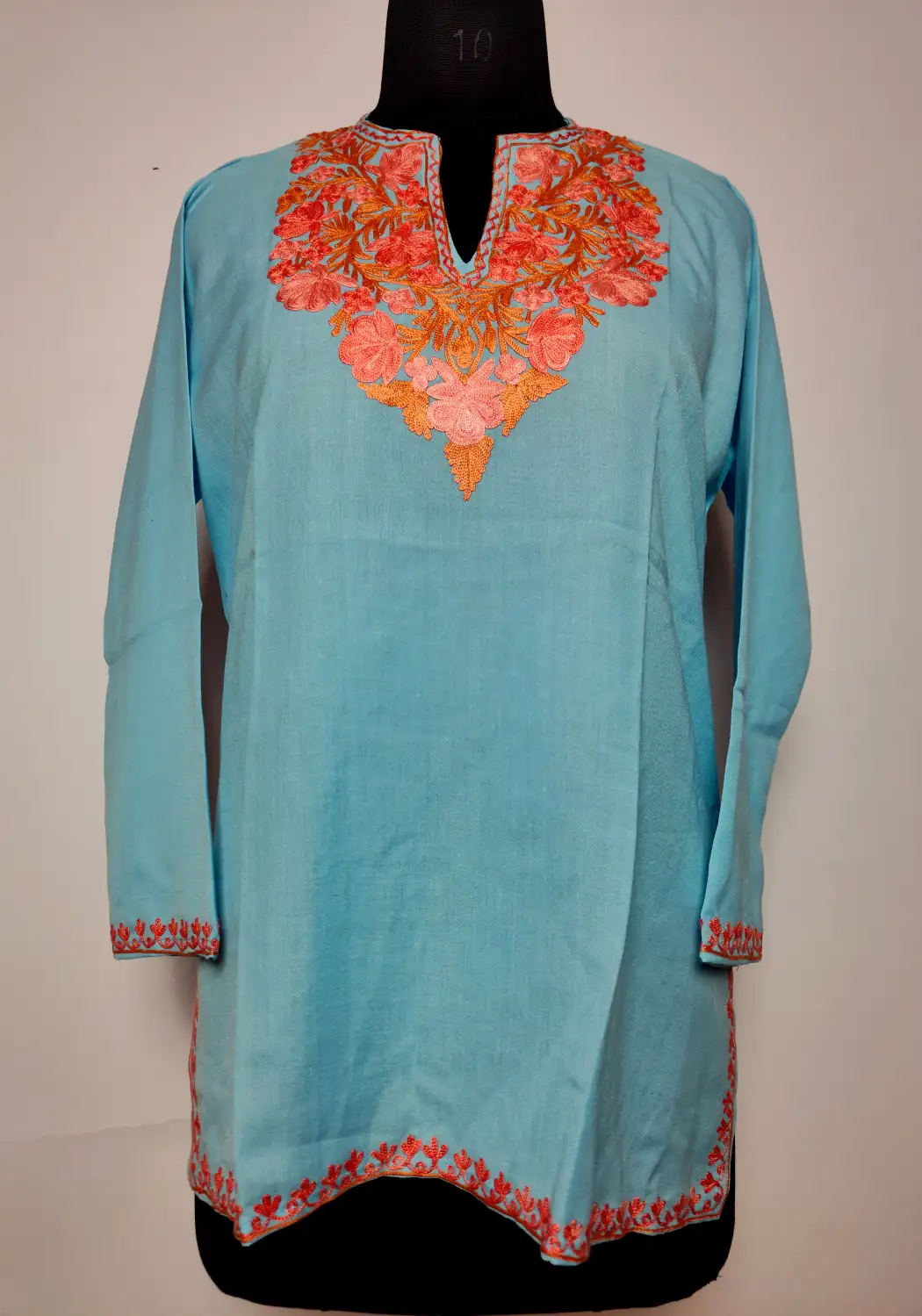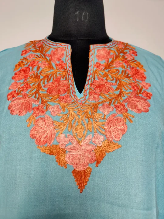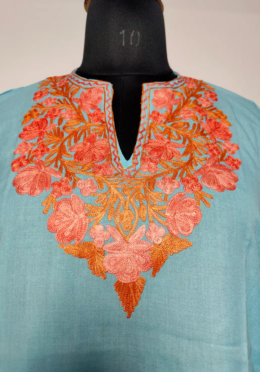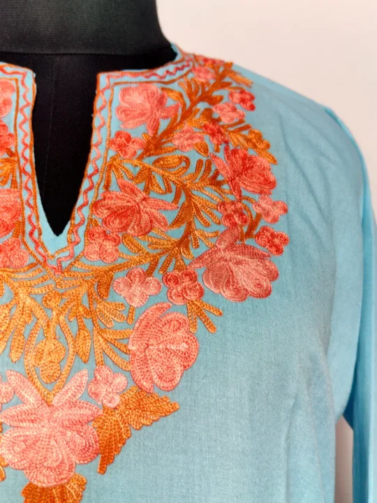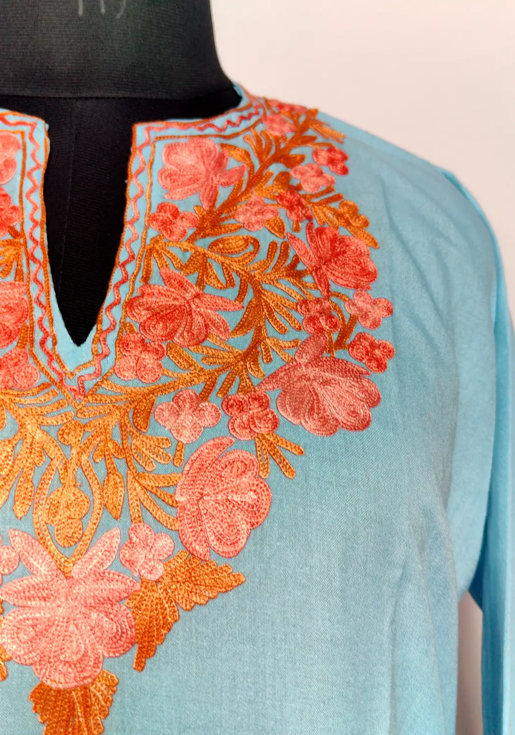 A soft floral touch at the neckline defines this aari work kurti design, it is set against blue summer cool cotton. The fabric feels breathable and smooth, which makes it ideal for regular wear. It carries a neat balance of simplicity and Kashmiri craftsmanship.