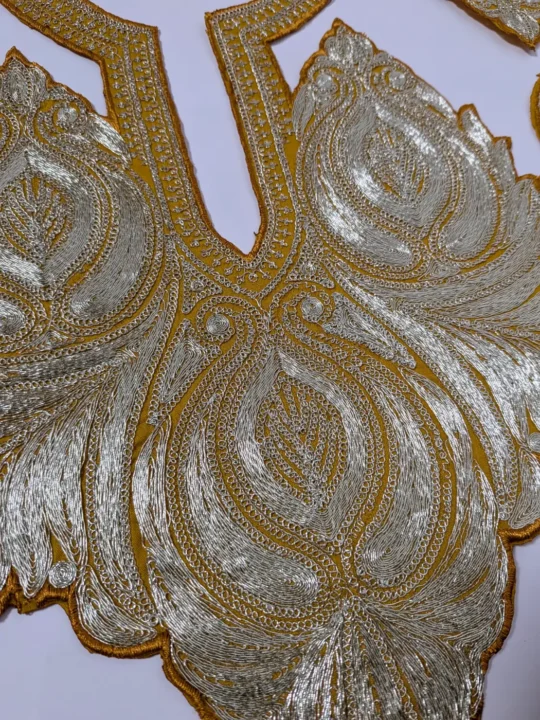 The neckline along with sleeve patches carries intricate badam and floral patterns, bringing together traditional Kashmiri elements in a visually rich and elegant composition. Designed with silver tilla embroidery, this yellow patch showcases continuous chinar motifs across the lace.