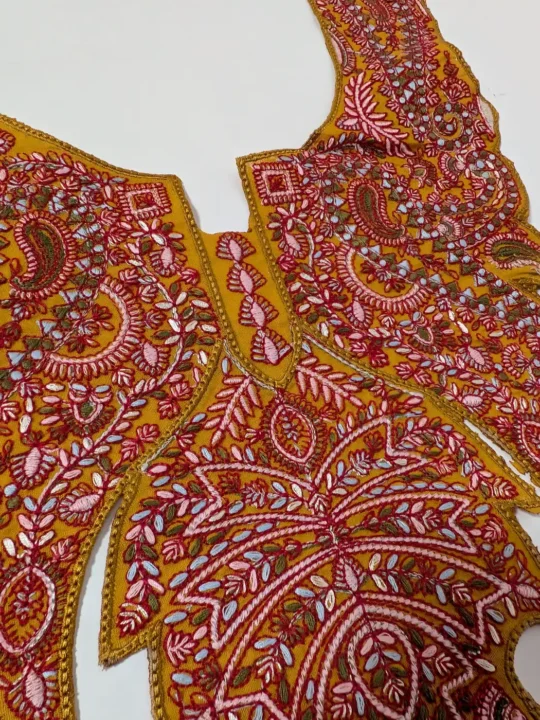 Floral embroidery defines the neck patch and sleeve patches in this yellow-based set, while the lace flows with continuous sozni work. Crafted with attention to traditional detailing, this patch set brings together all elements in a way that feels complete and visually balanced.