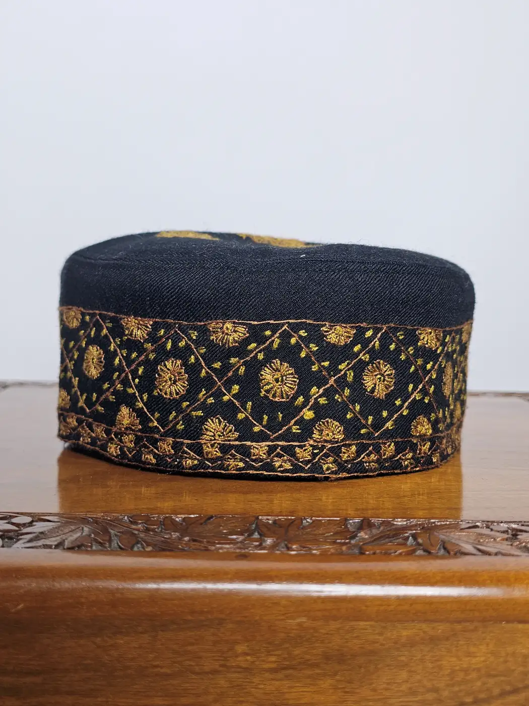 From the heart of Srinagar, this black color pure pashmina cap showcases the finesse of hand Sozni embroidery. the embroidery features geometrical patterns around the border and floral bootis on top with mustard color threads. It is true premium accessory, it exudes luxury in both fabric and finish. It has been designed for men of taste, it pairs effortlessly with traditional attire, lending dignity and Kashmiri grace to every occasion. It is a cultural emblem made wearable.