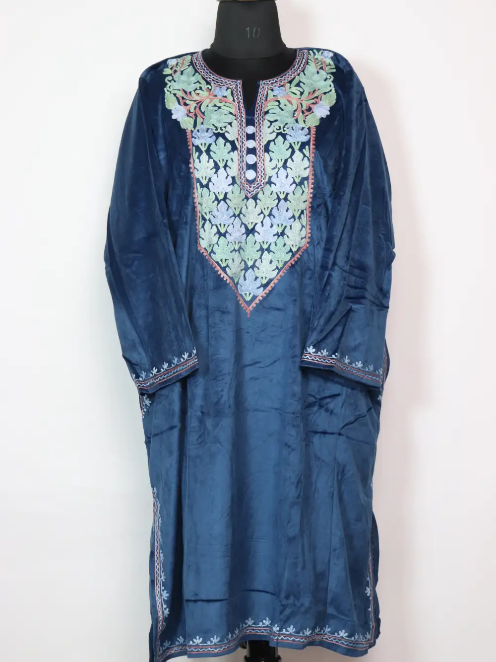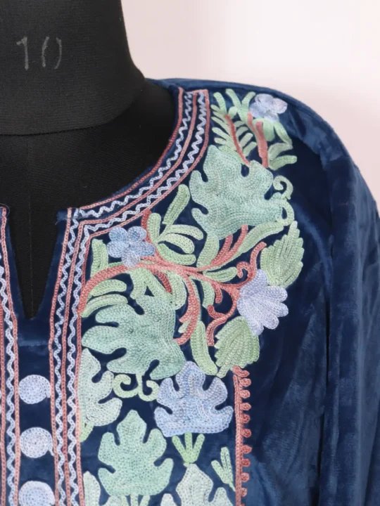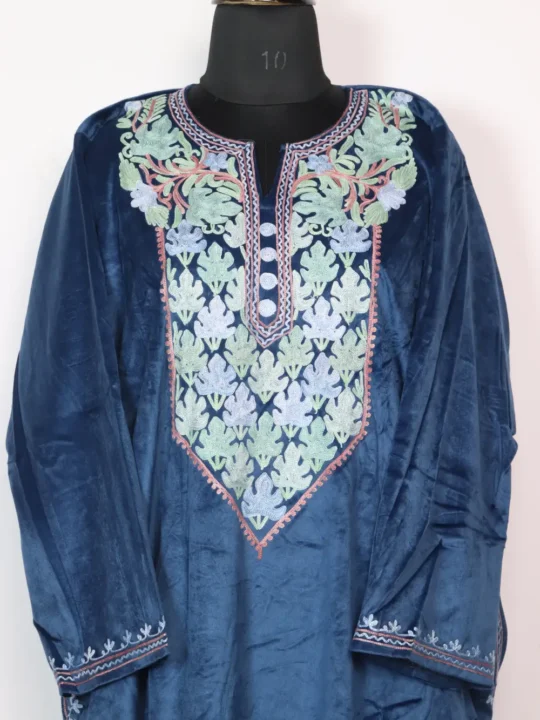 Royal blue Makmal and Aari at the neckline showcases chinar motifs in green and blue chinar motifs that define this Kashmiri Pheran with a 60 inch chest and a 44 inch length that drapes softly. This fheran’s neckline brings a gentle decorative note, while the its cut preserves comfort for everyday winter wear. It’s a natural choice for shoppers who search aari work pheran and prefer calm, velvet trims rather than heavy surface work.