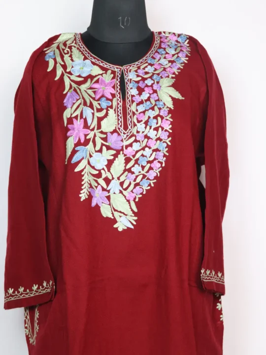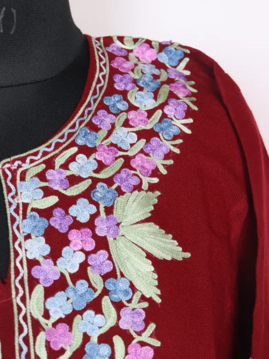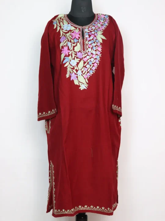 A beautiful maroon Cashmilon pheran adorned with charming floral aari embroidery across the neckline. Designed for style and warmth, it’s finished with two handy pockets for comfort.