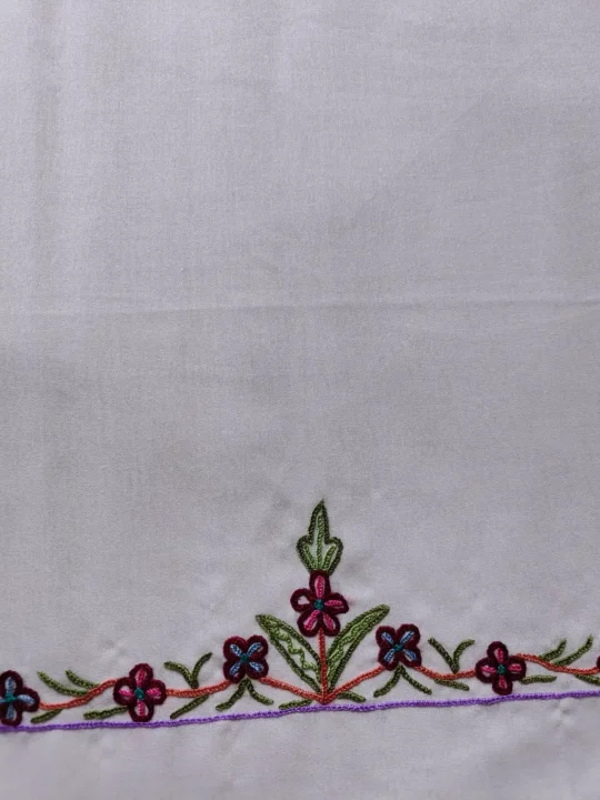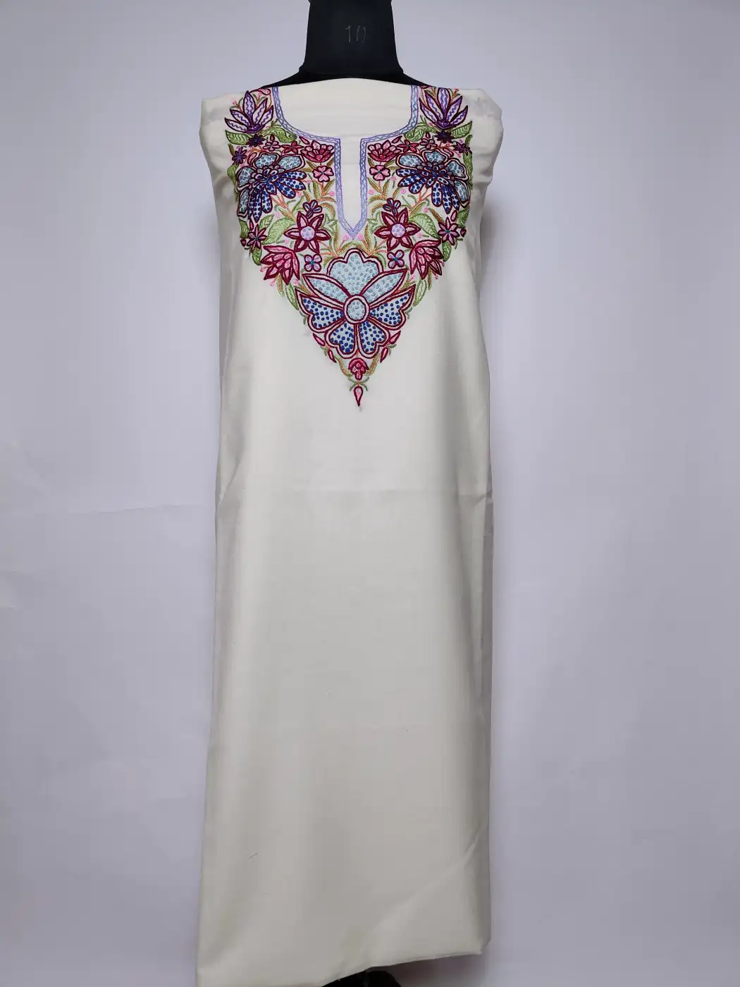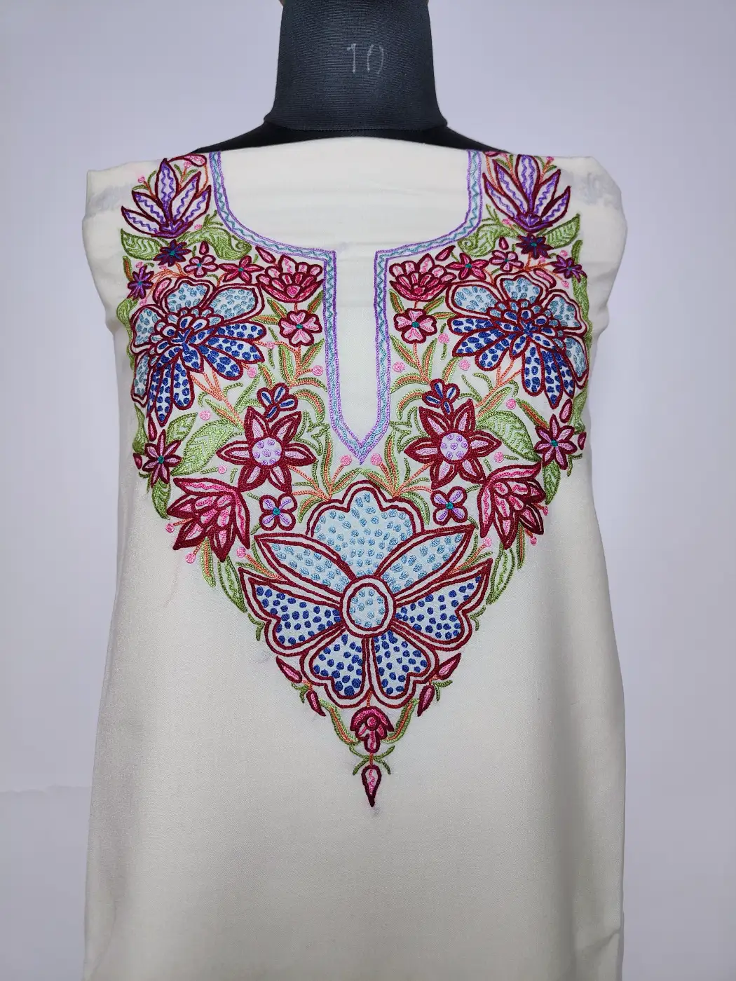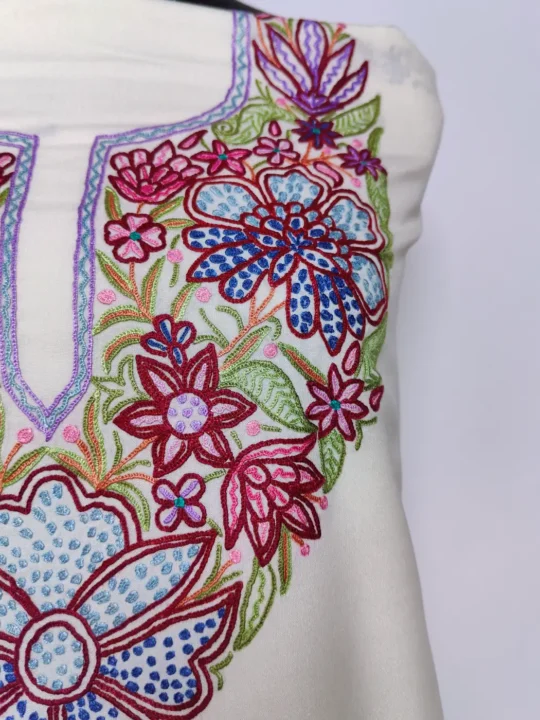 Traditional kashmiri 2pc suit like this focus on balance. A white ruby cotton base paired with floral neckline aari embroidery done with hand creates a neat look. The kurti and trouser come unstitched, gives you freedom to customise the fit while enjoying its simple, rooted design.