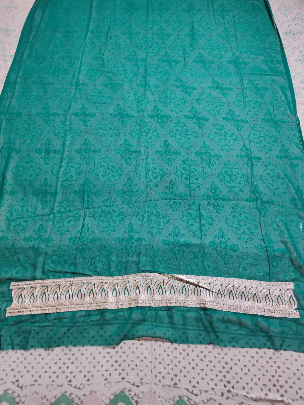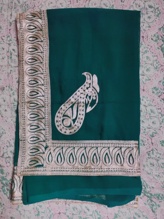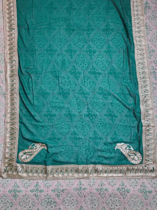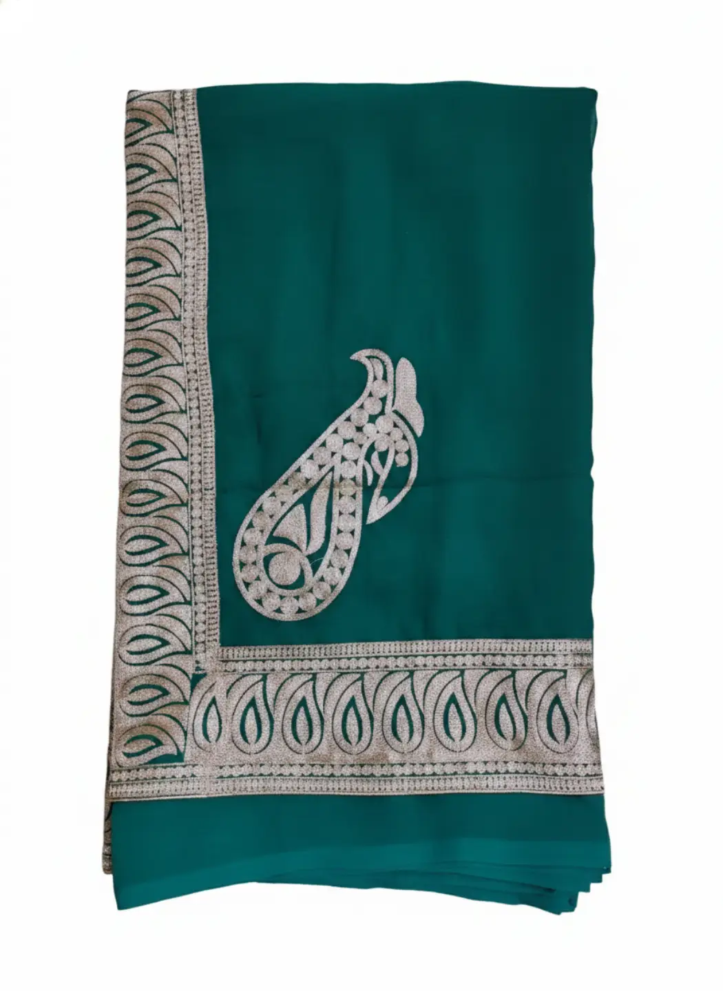 This designer kashmiri saree comes in classic green georgette with a clean, plain base. Along the borders, fine zari work forms continuous badam motifs between two straight lines. And the large badam motifs at the corners complete its look softly. It has simple detailing with a rich touch, which makes it suitable for functions.