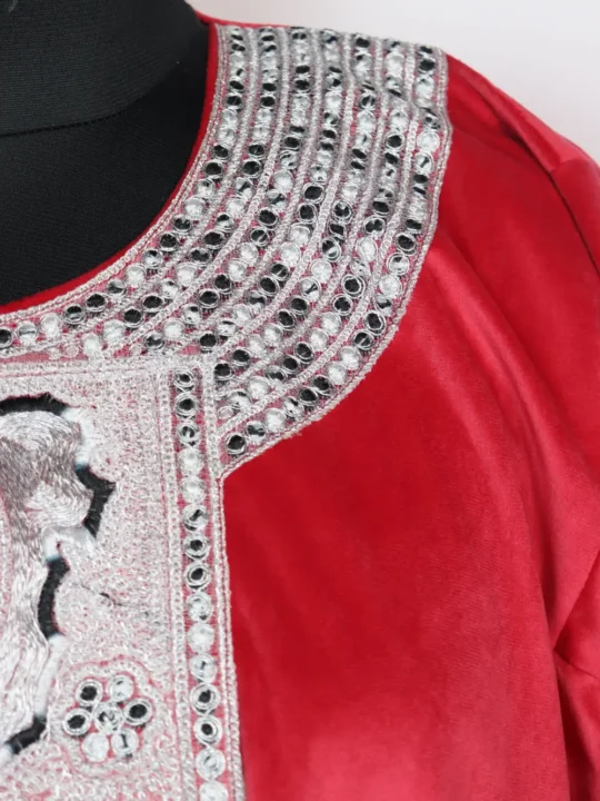 This Holland velvet pheran carries fine zari tilla kadhai around the neckline with chinar that makes it look beautiful. With a 56-inch chest and 45-inch length, it feels easy to wear and warm for winter. A good pick for anyone who likes a touch of Kashmiri work in their wardrobe.