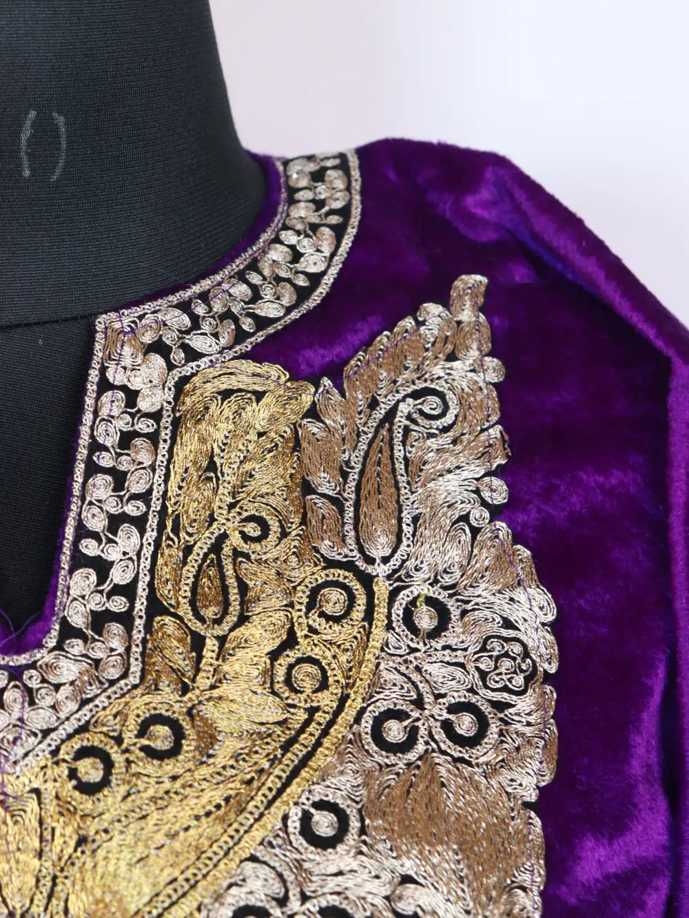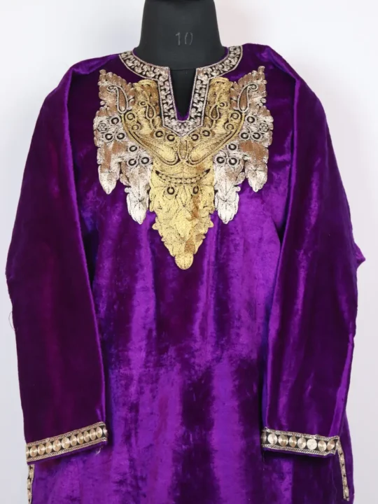 Soft Makmal (Velvet) weaves comfort into this purple Kashmiri Pheran, which is enriched with bronze and golden Zari Tilla Kadhai across the neckline. Two handy side pockets and a relaxed 56-inch chest and 45-inch length makes it ideal for colder days. This pheran offers both grace and warmth, it is designed to highlight your winter style.