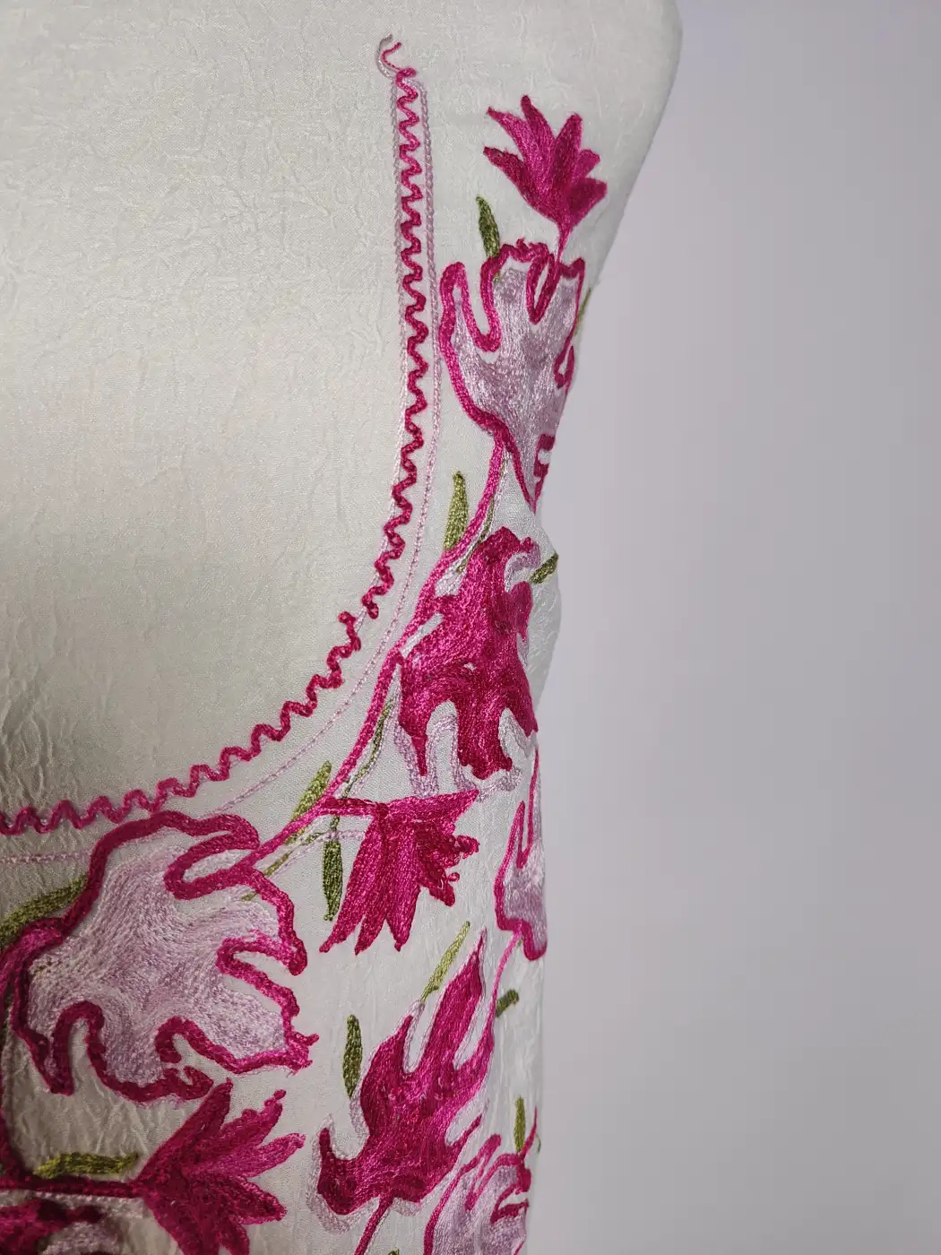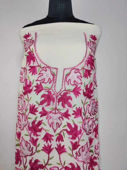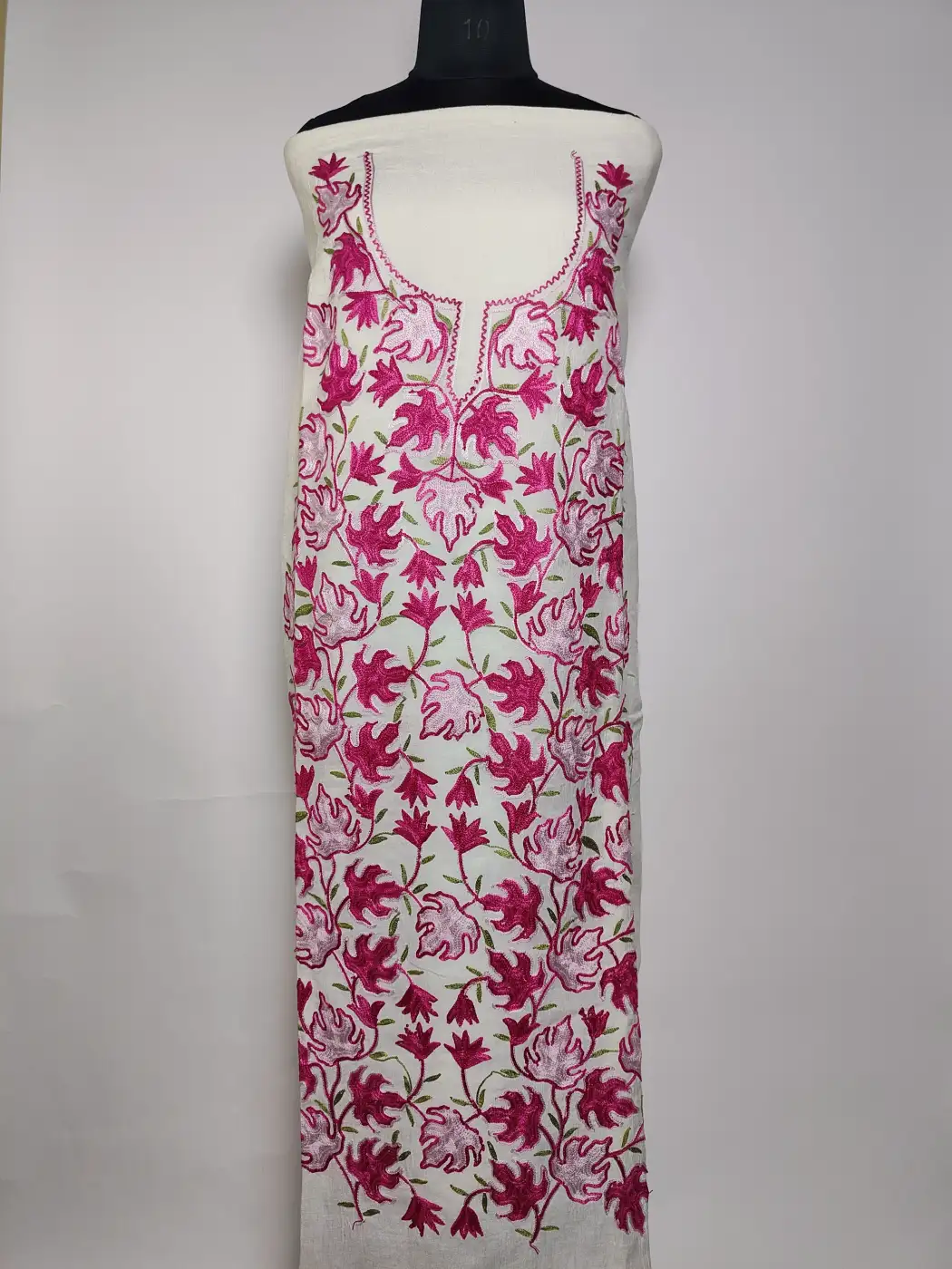 White crush cotton forms the base of this Kashmiri suit material, which is enhanced with all-over chinari embroidery. The aari work gives it a refined look from every angle. You will get it unstitched as kameez and salwar, it lets you create your own perfect fit.