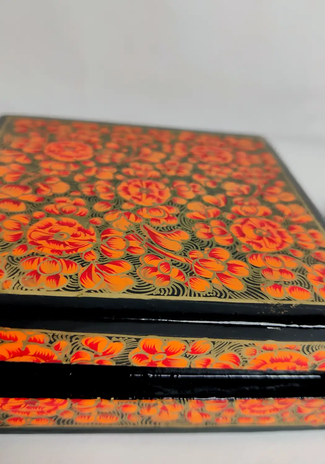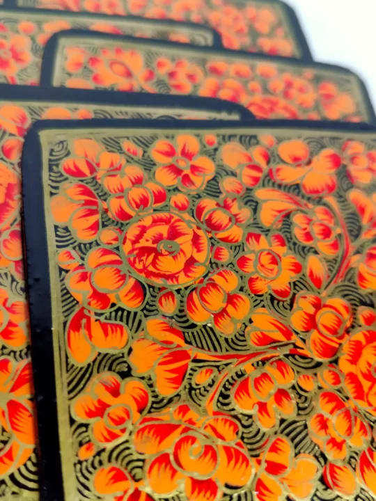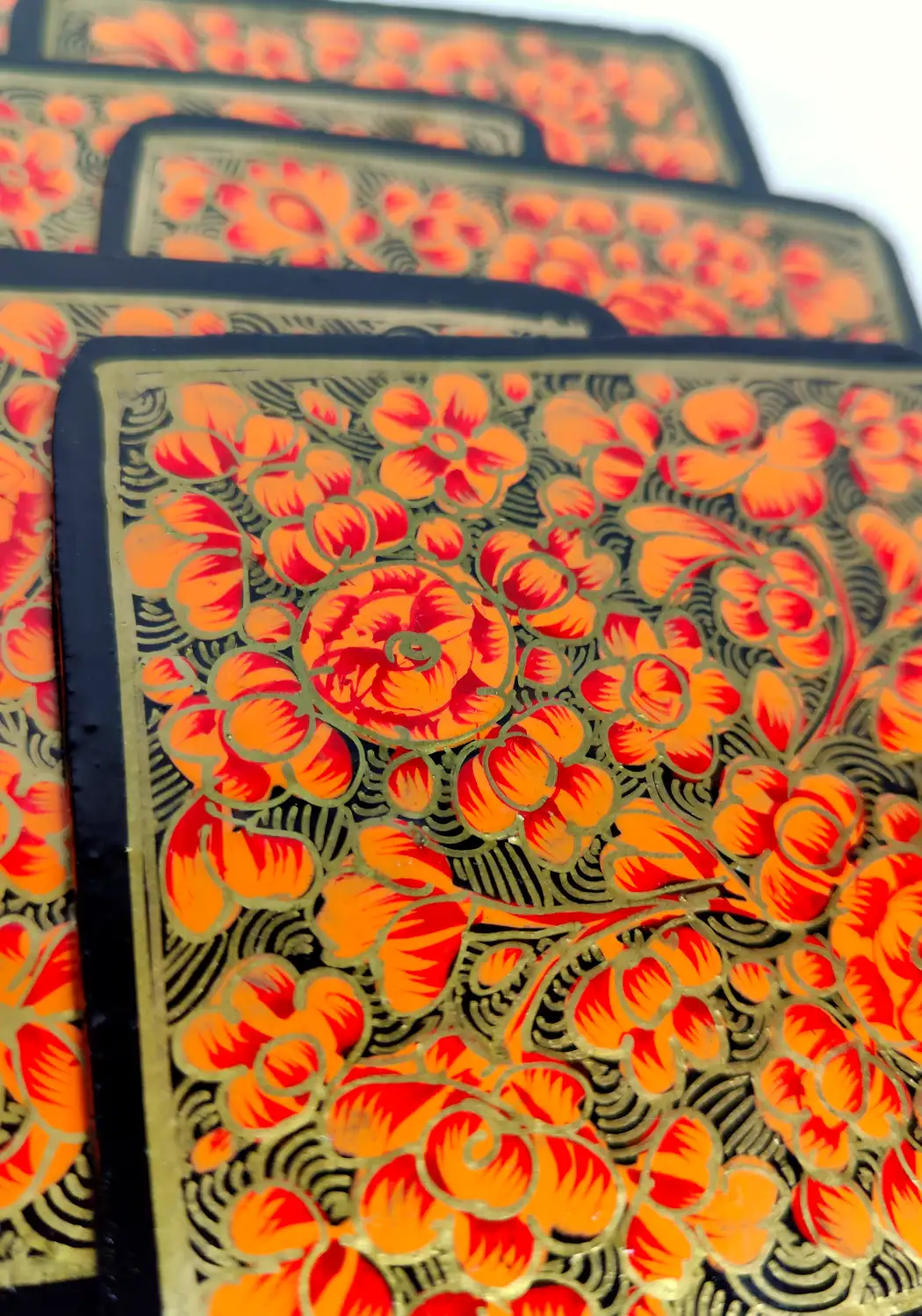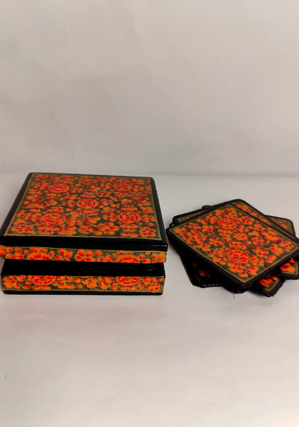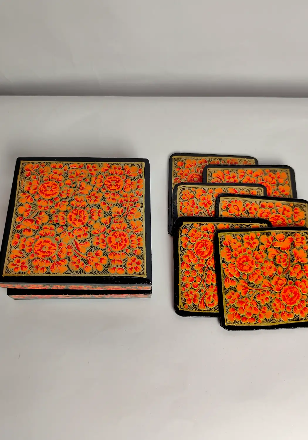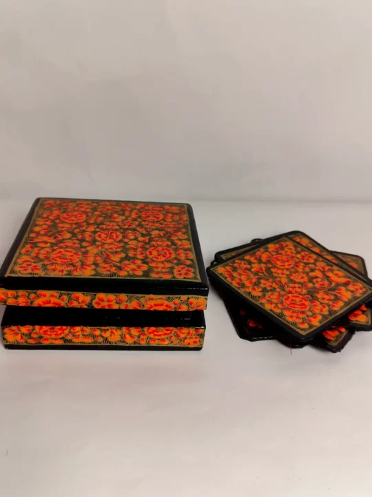 There’s a subtle beauty in this coaster set, where six square coasters sit inside a box, each carrying orange hue floral paper machie embroidery. The detailing feels light yet noticeable which gives a touch of Kashmiri artistry to your table.