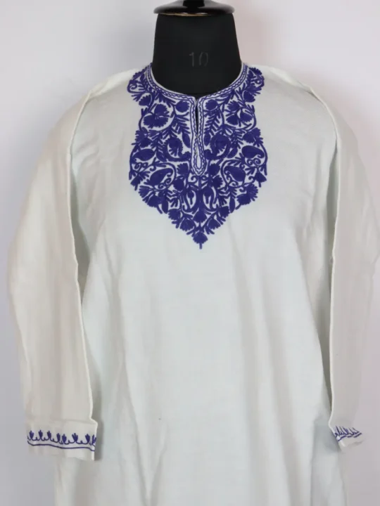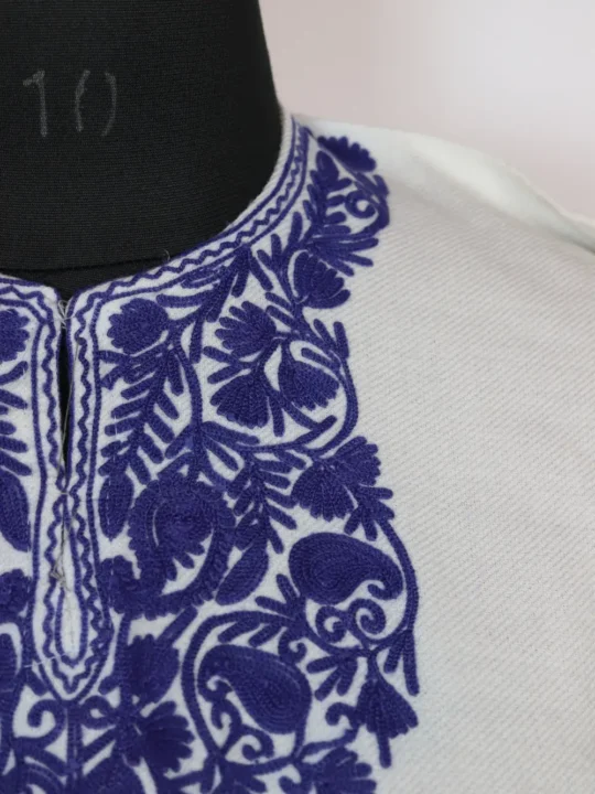 Beautifully crafted from warm Cashmilon, this white short Kashmiri Pheran is defined by floralĀ badam Aari kadhai at the neckline in dark blue hues. With its two practical side pockets, 46-inch chest, and 38-inch length, it offers elegance with ease. It is a must-have for the season, this Pheran mirrors the style often admired in pheran kashmiri wear.