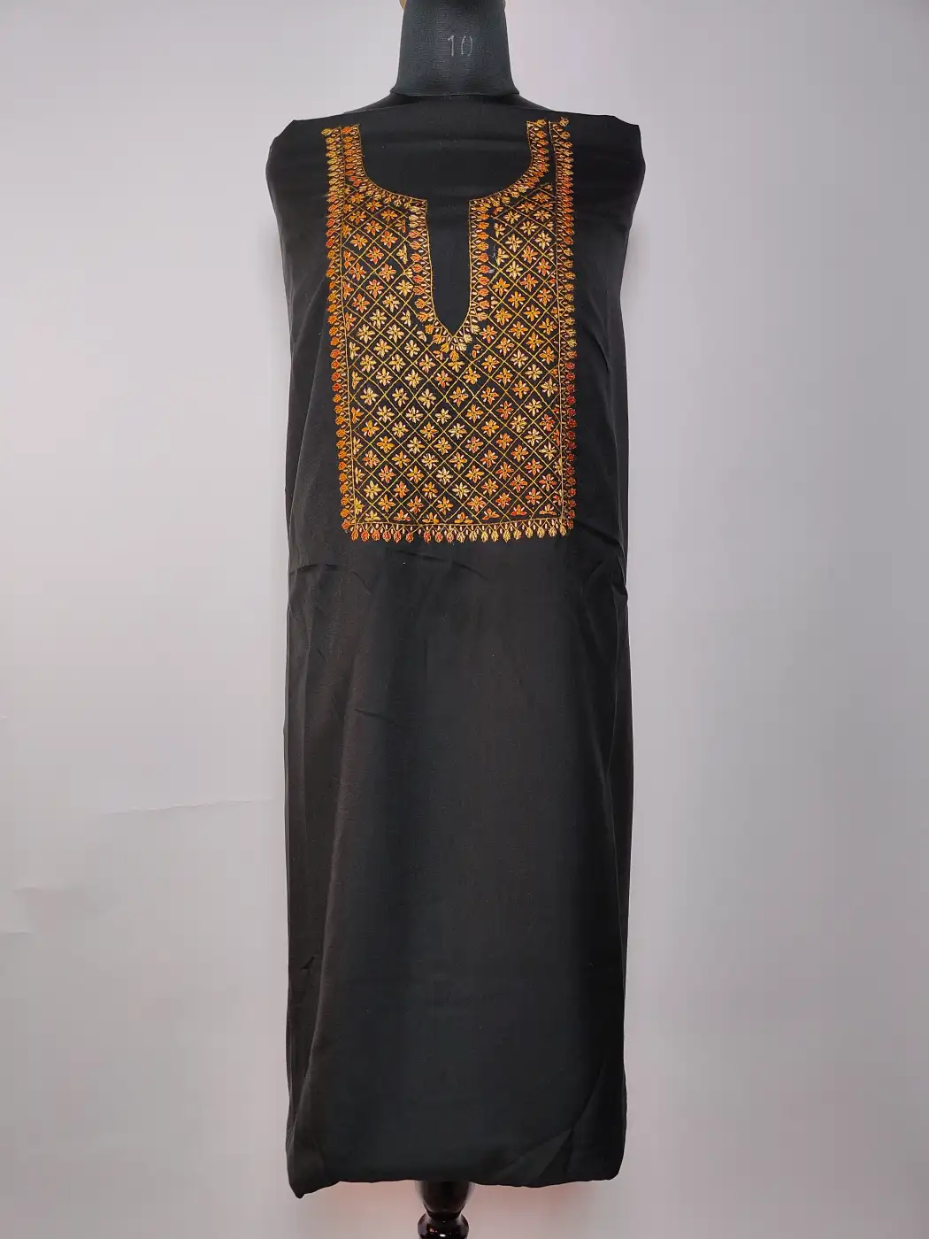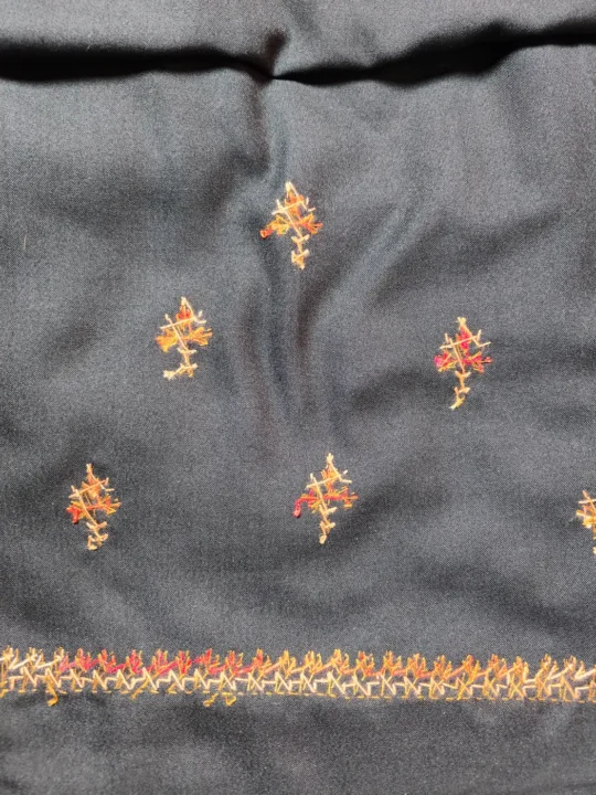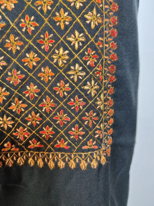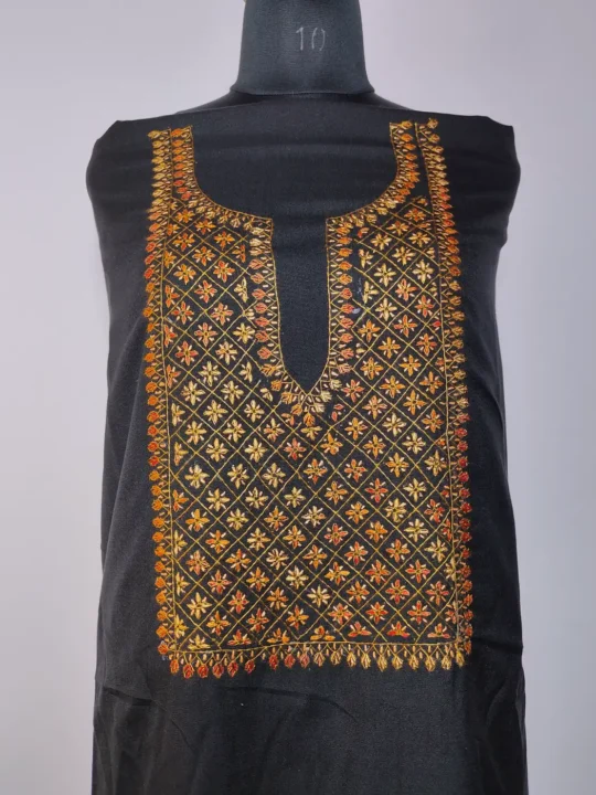Geometrical floral hand sozni embroidery defines the neckline of this Kashmiri suit material, which has been done against a rich black summer cool cotton base. Offered as an unstitched 2pc salwar kameez, it allows you to create a look that feels comfortable, graceful, and entirely your own.