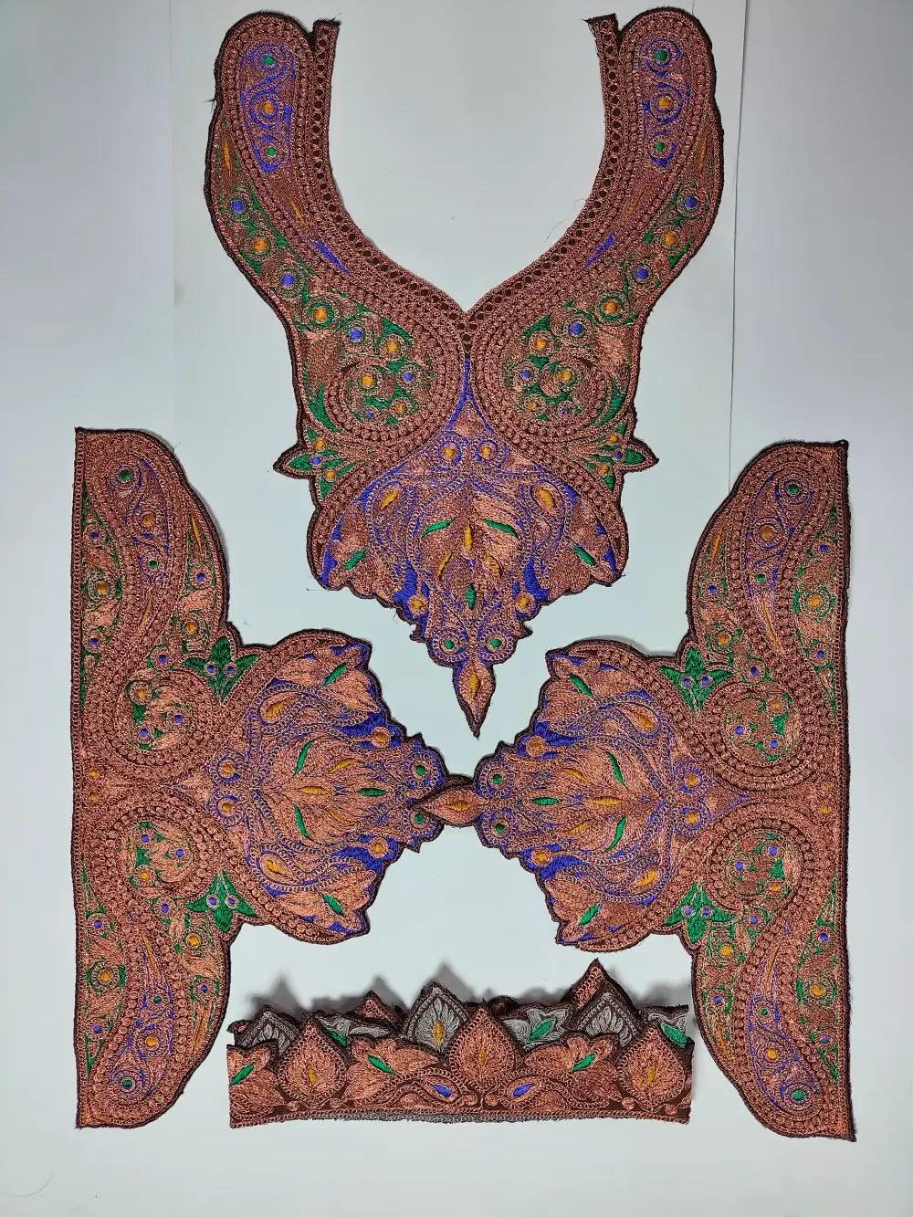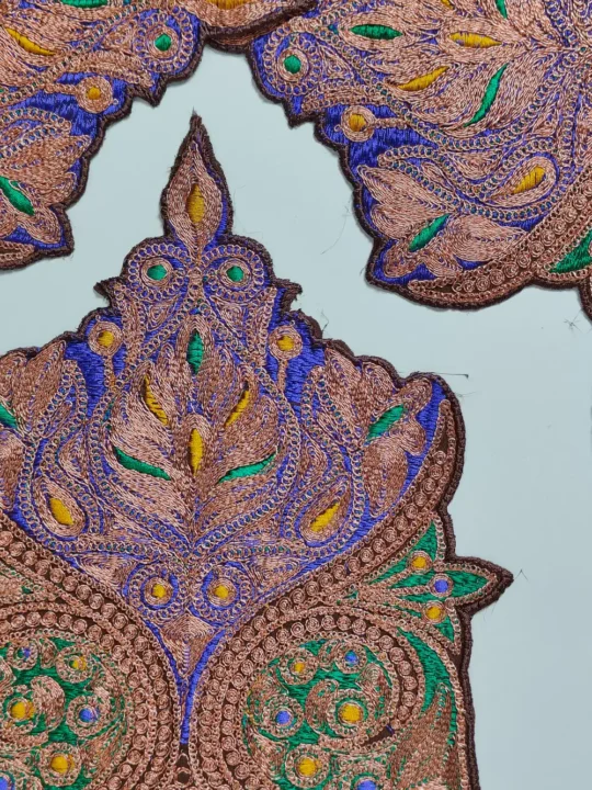 Decorated with elegant tilla work in chocolate brown tone, this patch represent Kashmiri beauty. It fits easily on pheran necks, kurti fronts, or shirts.