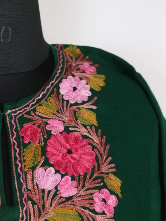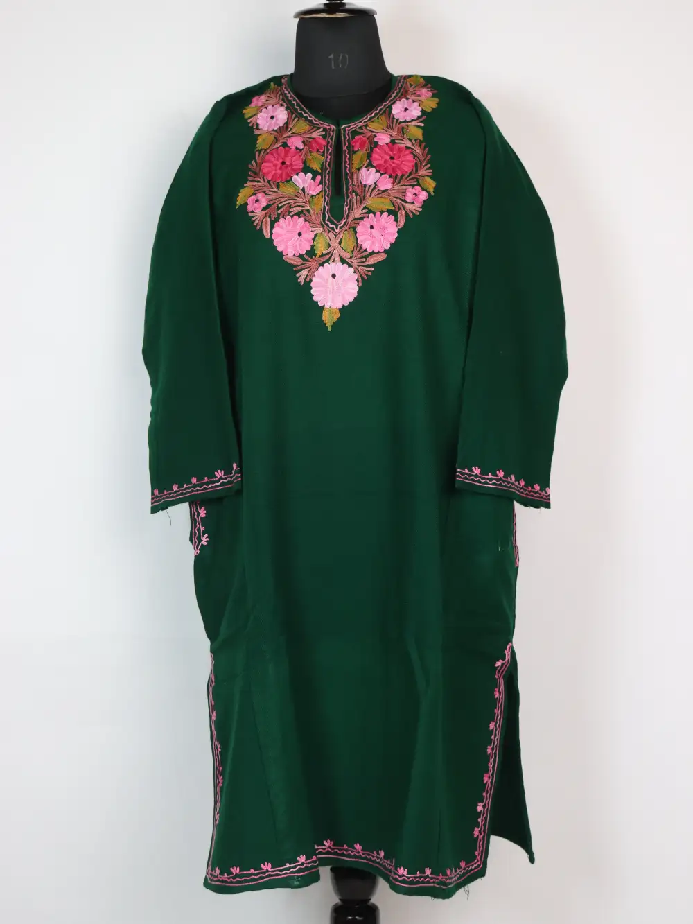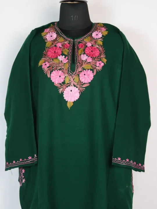 Soft Cashmilon wool frames this dark green Kashmiri Pheran. It is adorned with floral Aari embroidery at the neckline; it comes in 48 inch chest size and 43 inch length it drapes comfortably for winter wear.