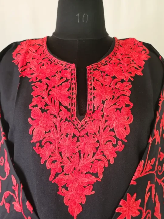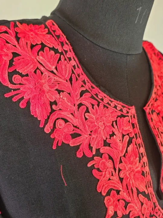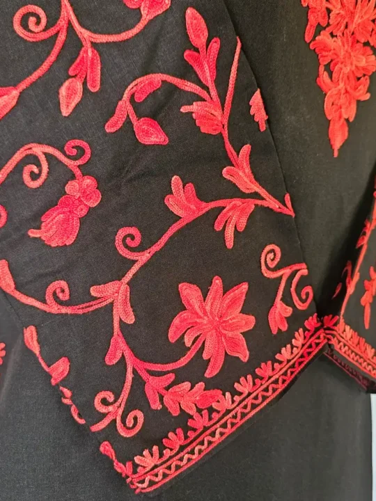 Tailored in soft Ruby Cotton, this black short kurti feels like ease stitched into form. The Aari embroidery stands out with neckline and sleeve florals with red color threads, each one done with care. It’s a wear-it-anywhere piece—calm enough for everyday and elegant enough for a casual get-together.
