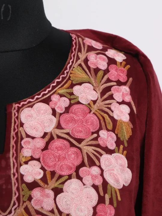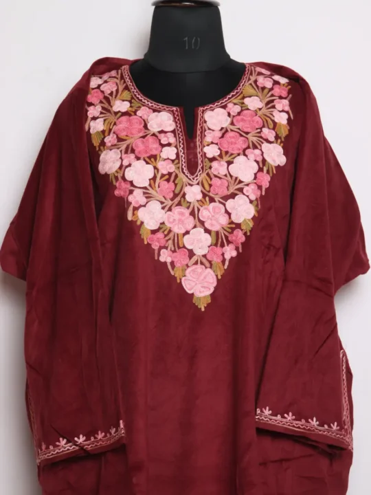 This is a velvet Pheran in maroon with floral Aari kadhai at the neckline in pink hue threads, it is sized to a 58 inch chest and 43.5 inch length to sit comfortably over outer layers. This Pheran shows careful handlike stitches around the neckline while the rest of the surface remains calm and wearable. You can consider the Pheran when you want gentle winter warmth without fuss and when you check phiran online for simple elegant pieces.