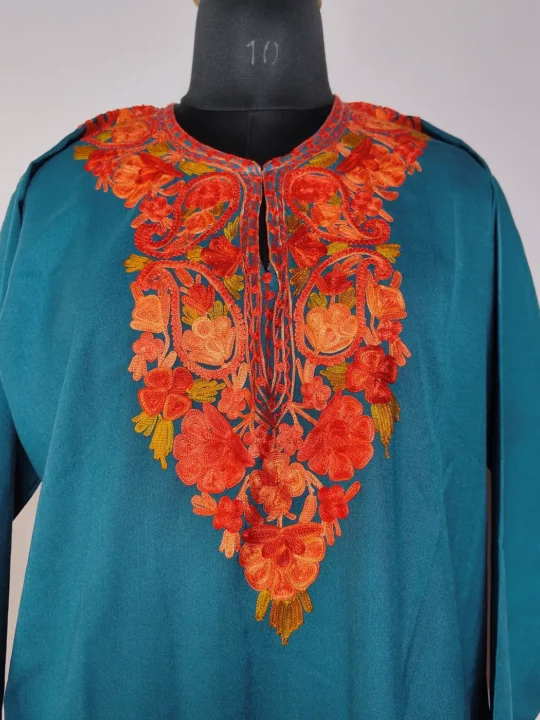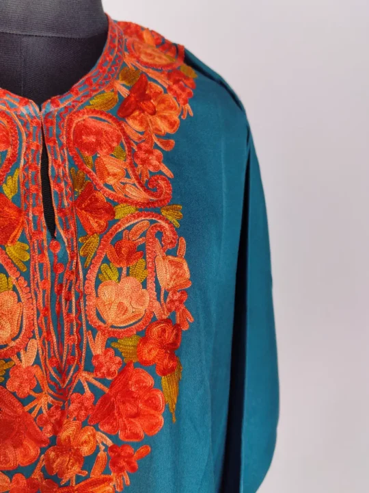 A hint of Kashmiri craft appears through badam floral embroidery at the neckline of this Kashmiri sea green kurti. Made in summer cool cotton, this Kashmiri work long kurti keeps things light and easy, offers a traditional touch without feeling heavy.