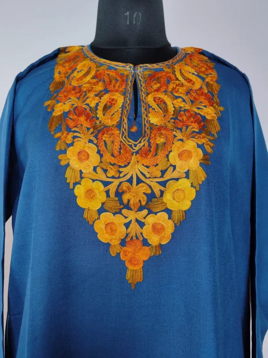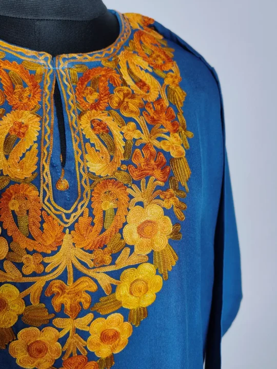 Floral aari embroidery at the neckline adds a soft detail to this long Kashmiri sea green kurti. Made in summer cool cotton, this piece feels light and easy to wear, which makes it a practical yet graceful everyday option.