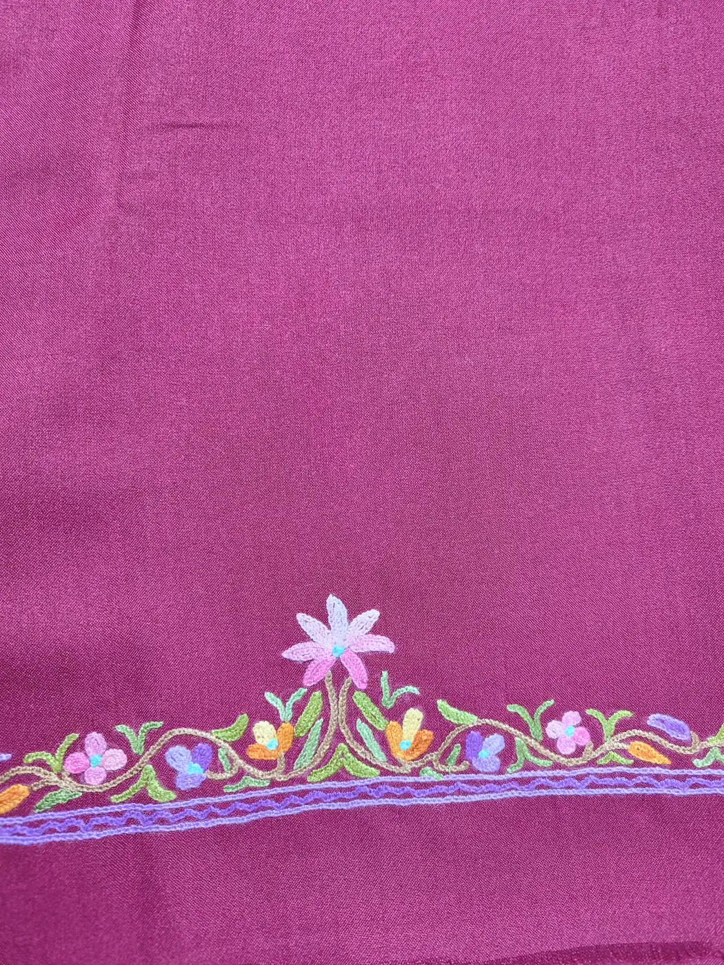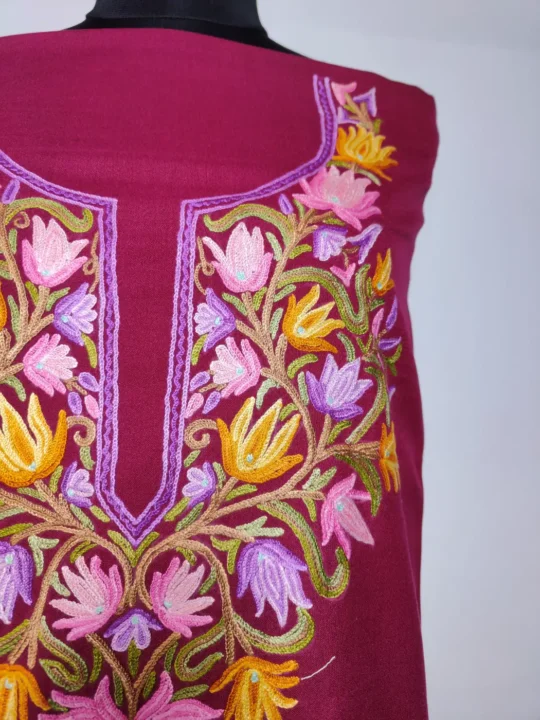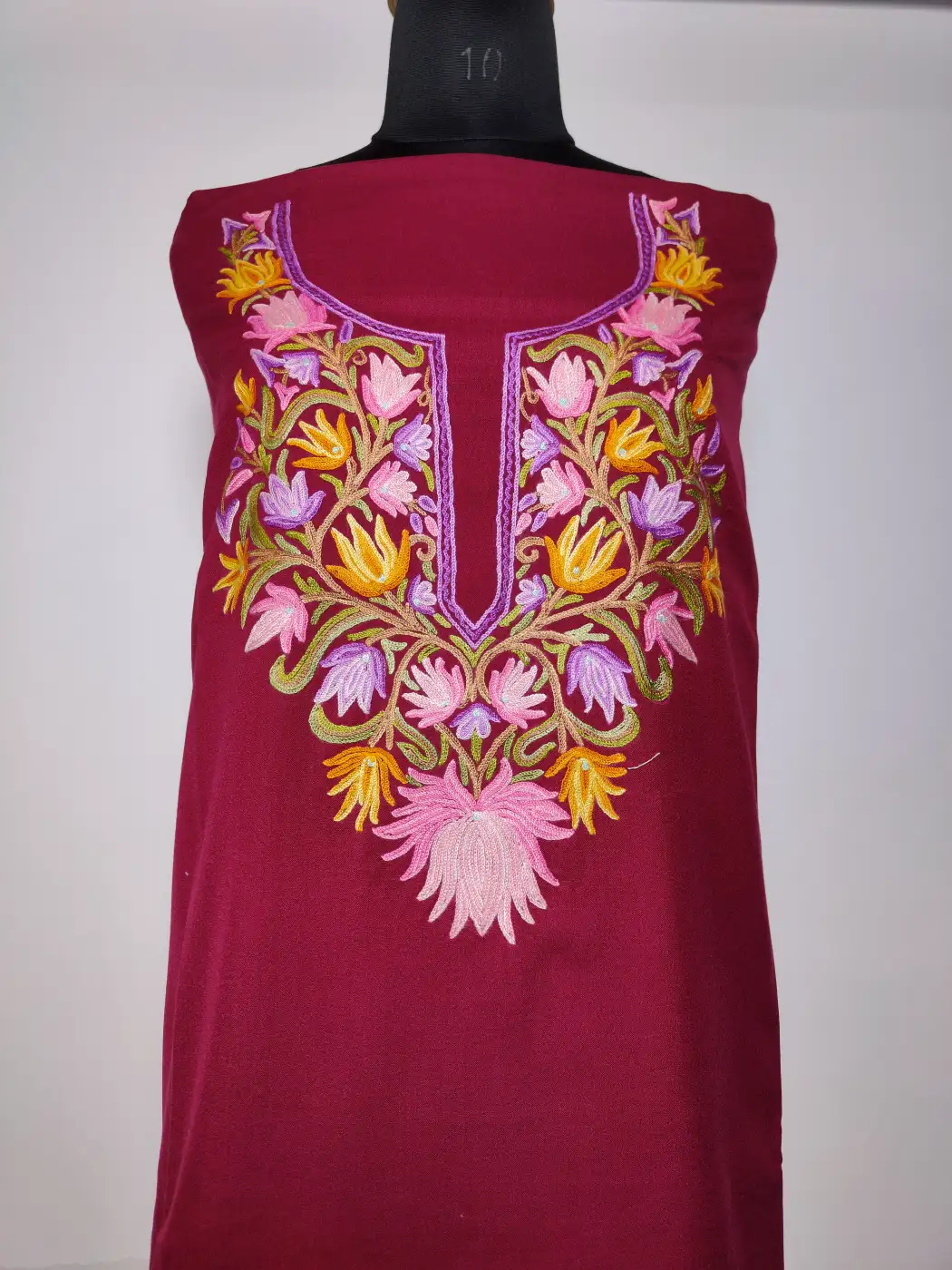 Floral embroidery enhances the neckline of this Kashmiri suit. Made from maroon colour summer cool cotton fabric with hand aari work, this Kashmiri suit comes unstitched so you can stitch it as desired.