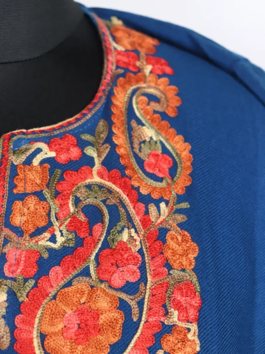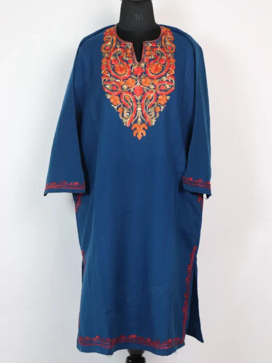 Designed in cashmilon wool, this midnight blue pheran is defined by its embroidery. Red-brown thread florals trace the neckline, while badam motifs in red floral outline appear across the same. The fabric’s warmth makes it reliable for cold days, while the embroidery keeps the style refined. It is a garment that is cozy, graceful, and versatile for daily wear during the winter season.