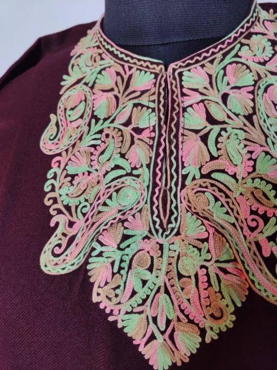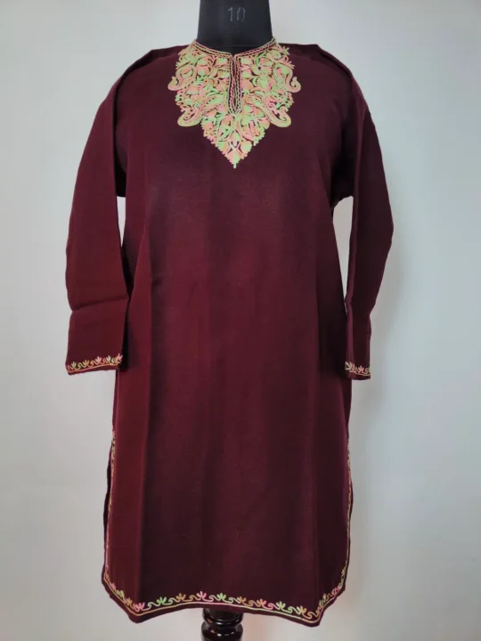 Light and cosy, this short pheran in wine colour made from Cashmilon wool fabric features pink and green badam motif Aari work near the neckline. Its 35-inch length ensures an easy, flattering fit. At ₹1299, it’s an affordable and charming winter piece that keeps you snug while bringing a hint of traditional elegance to daily wear.