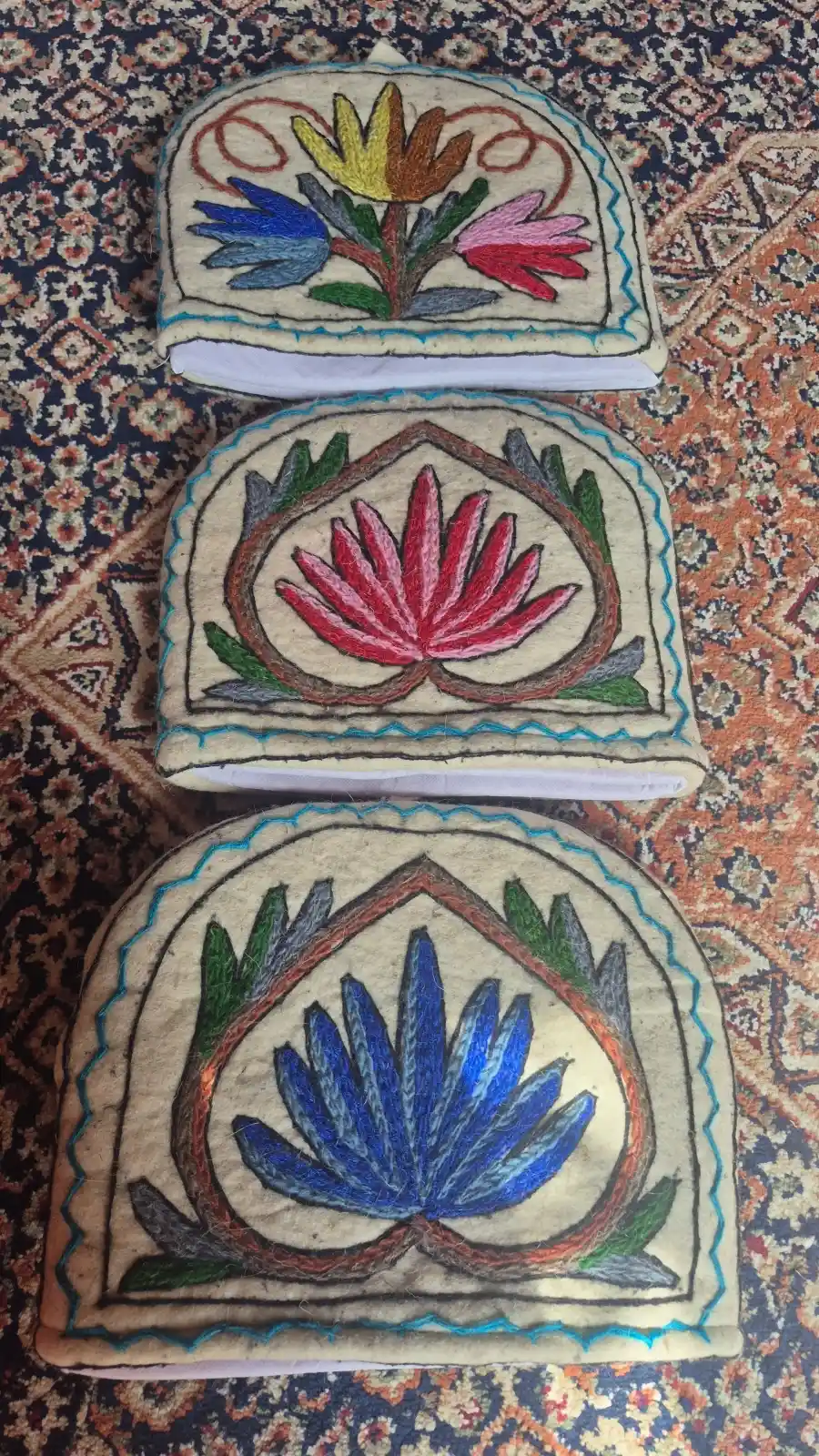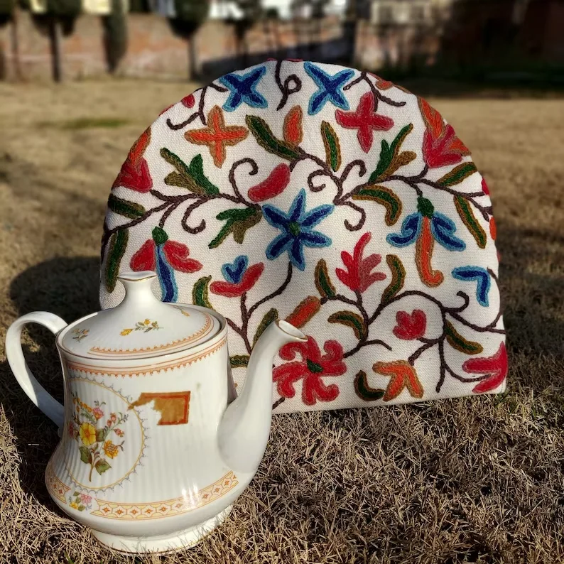 - Crewel Embroidery on Namda: The Namda tea cozy uses thick wool yarn and features the iconic “Aari” work with vibrant floral and paisley motifs.